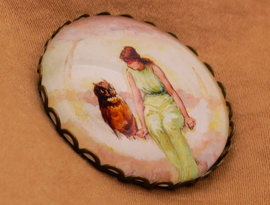 Owl Bird Lady Crescent Moon Glass Dome Bronze Lace Metal Button 31mm