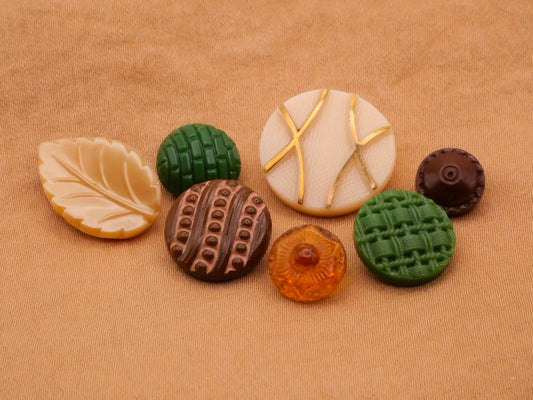 Glass Green Brown Orange Ivory Leaf Vintage Set of Seven Buttons 9-18mm