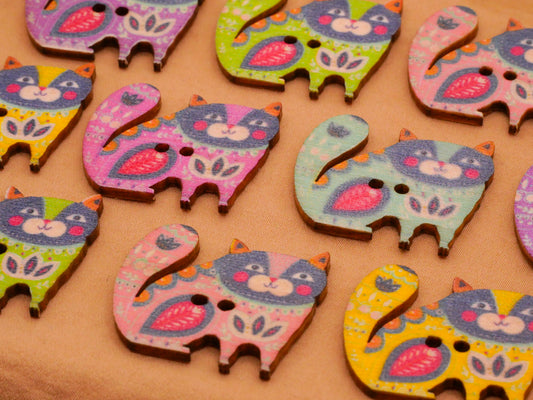 Cat Kitty Folk Art Hippie Pattern Wood Set of Ten Buttons 25x29mm