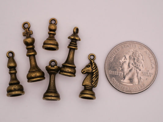 Chess Pieces Game Bronze Metal Set of Six Charms Embellishments 7-28mm