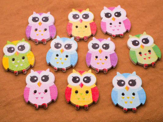 Owl Colorful Pastel Wood Set of Ten Buttons 19x25mm