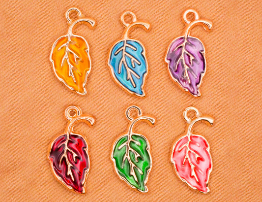 Leaf Leaves Colorful Enamel Gold Metal Set of Six Charms Embellishments 10x20mm