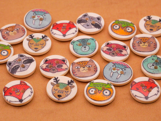 Animals Deer Bear Owl Fox Faces Wood Set of Twenty Buttons 15mm