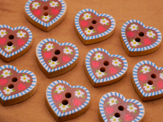 Heart Folk Art Hippie Flower Wood Set of Ten Buttons 17x18mm
