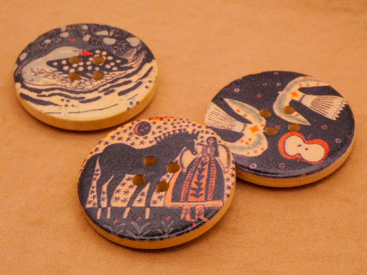 Folk Art Animals Goose Birds Horse Wood Set of Three Buttons 30mm