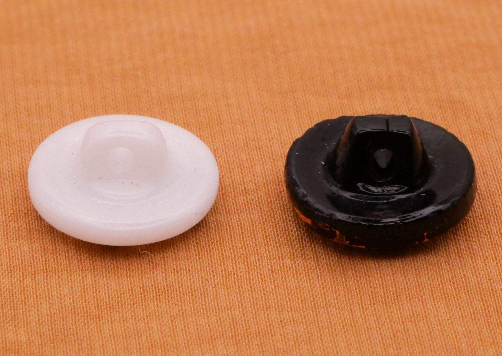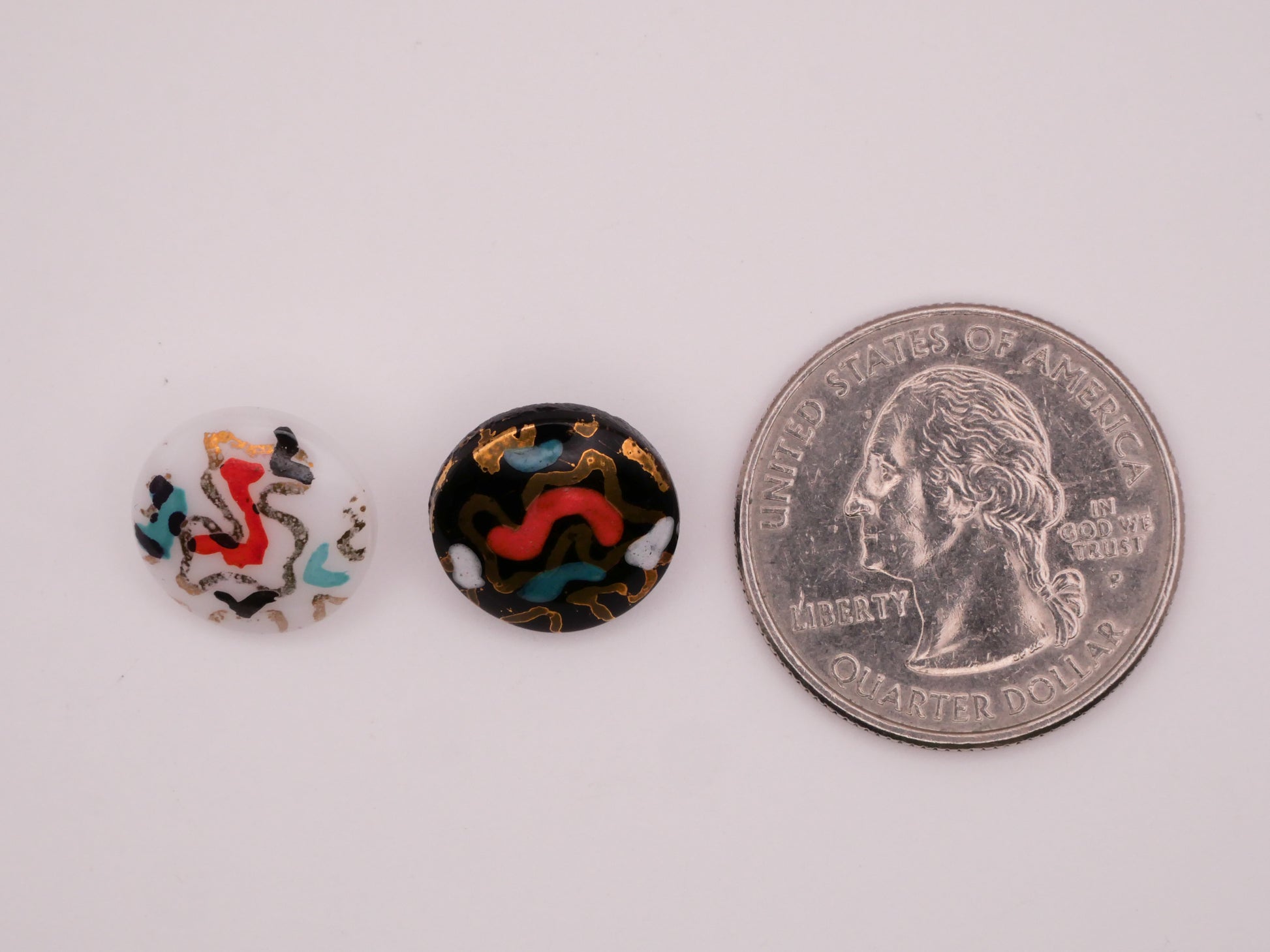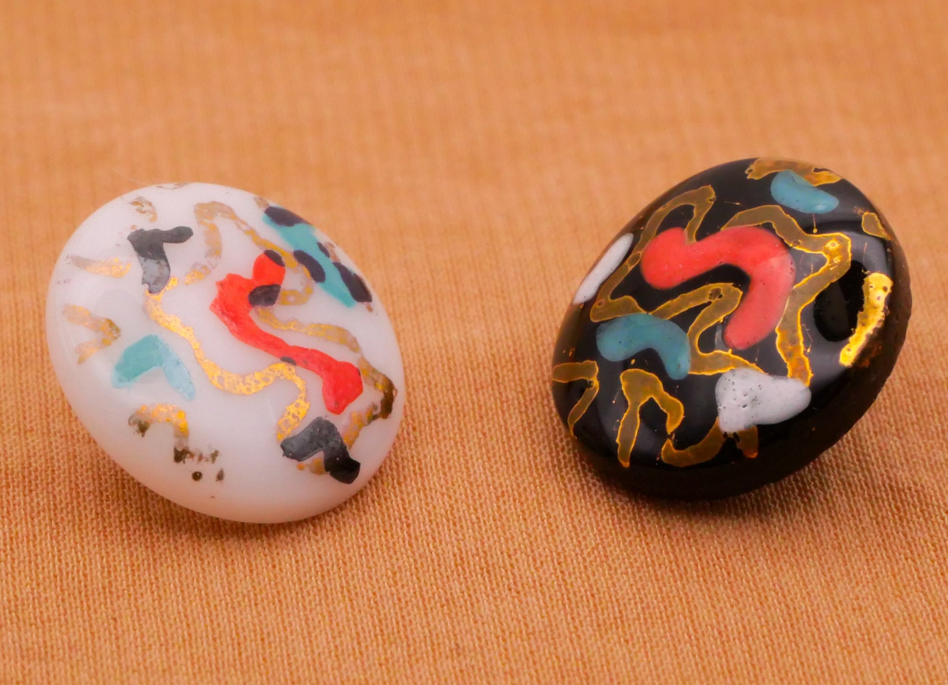 Very cool! Hand-painted vintage glass button with abstract designs in coral, teal, white, and gold. Design may have been fired after being painted. Each measures 13mm / .51" in diameter. Choose left or right.