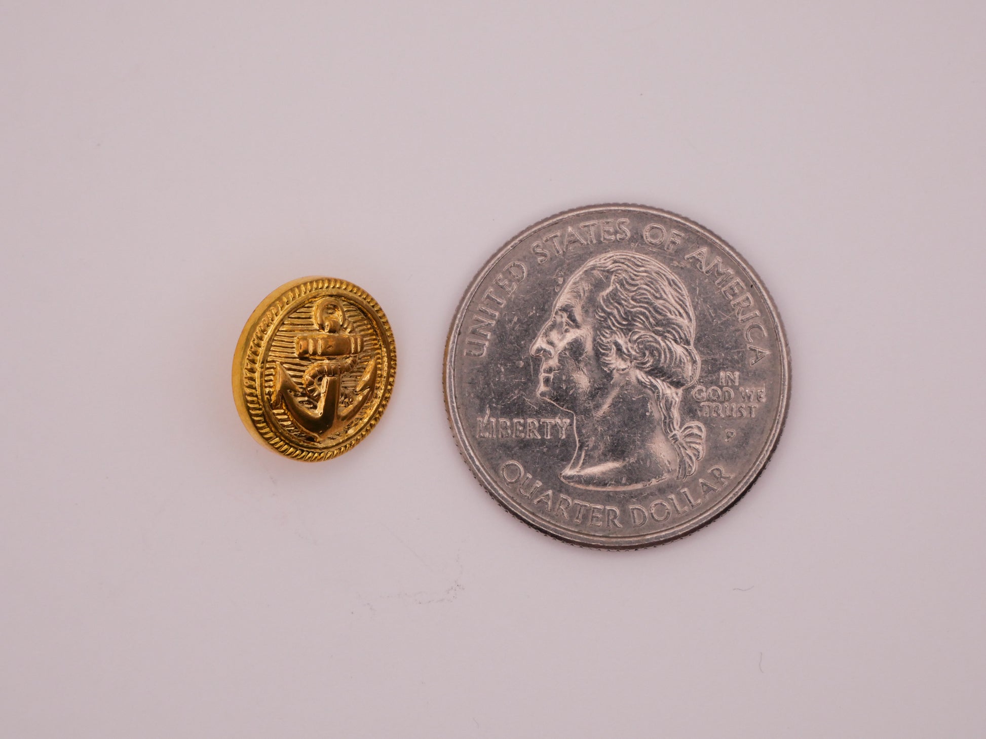 Great for your next project! Small gold metal look plastic button with anchor and rope design. Sold in set of four. Each measures 13mm / .51" in diameter.