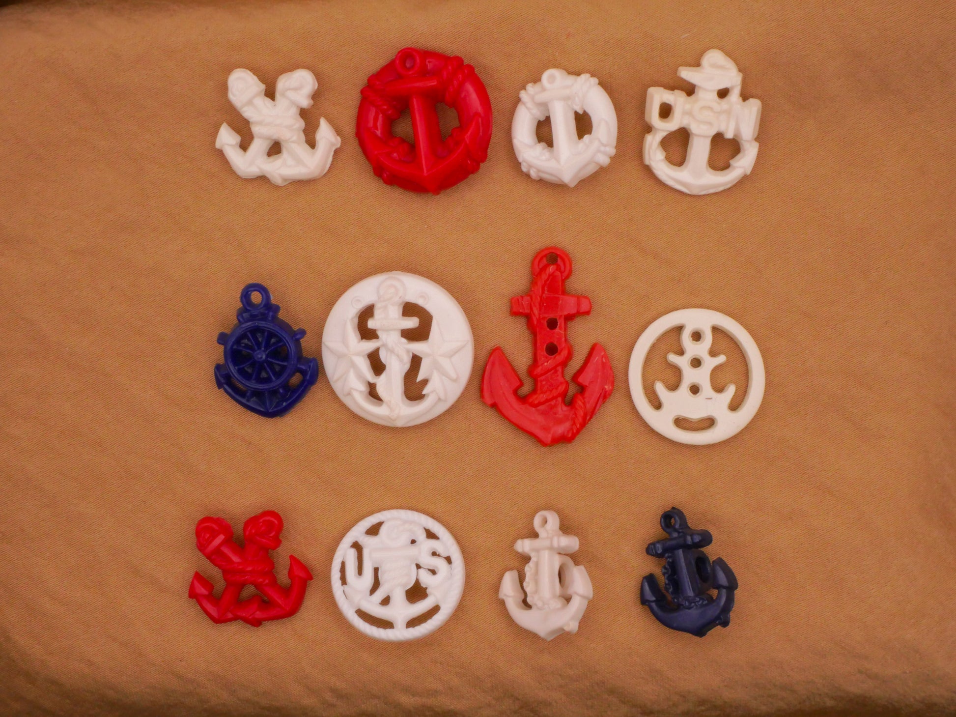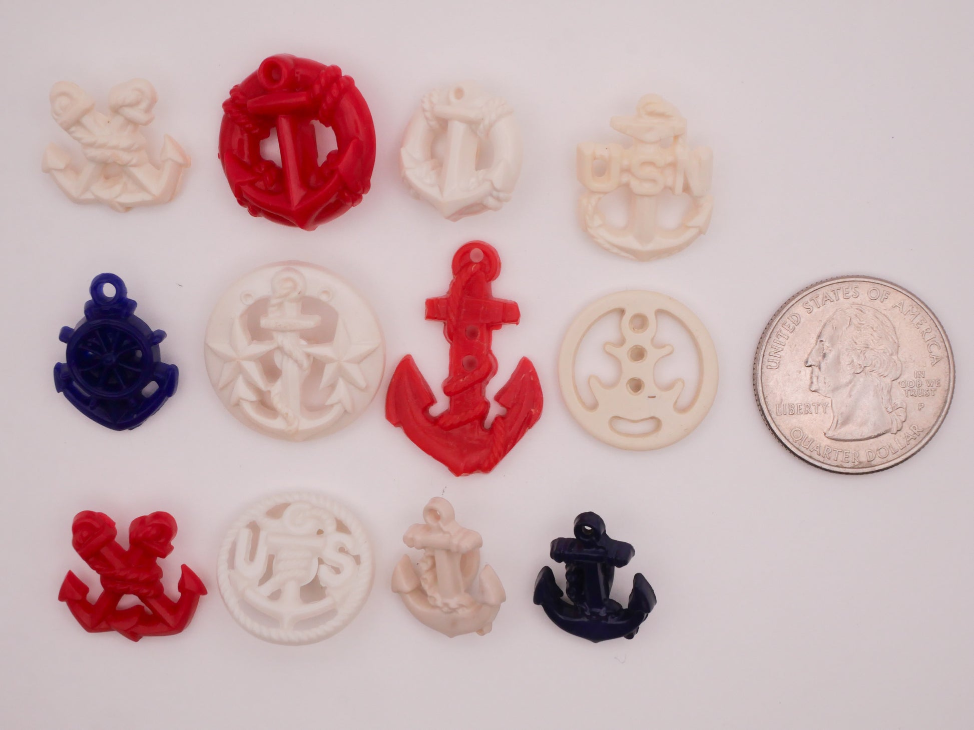 Fantastic selection of anchor goofie goofy vintage plastic buttons, choose your favorite style! These red, white, and blue buttons measure between 14-29mm / .55"-1.14". Choose A-L.