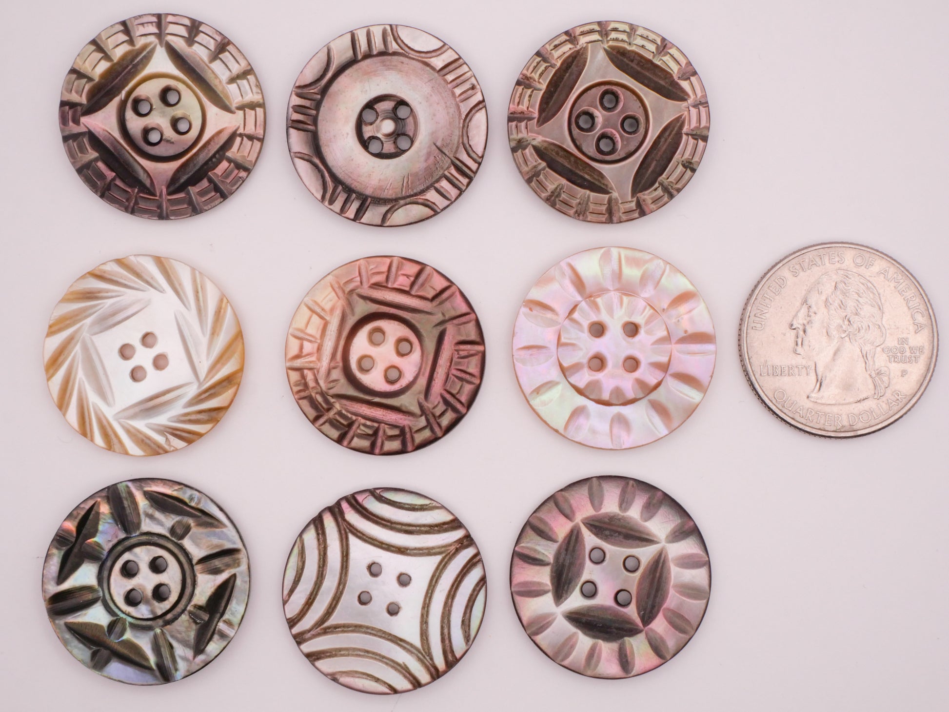 Beautiful selection of array or radial design carved mother of pearl vintage buttons, choose your favorite! These Shell buttons Measure between 24–25mm / .95"-.98". Choose top, middle, or bottom and left, center, or right.