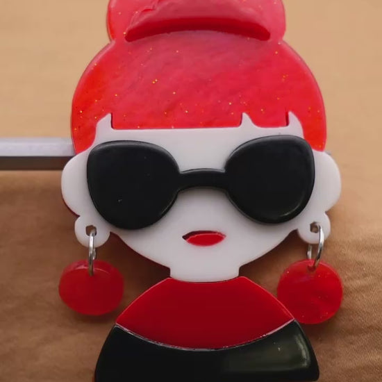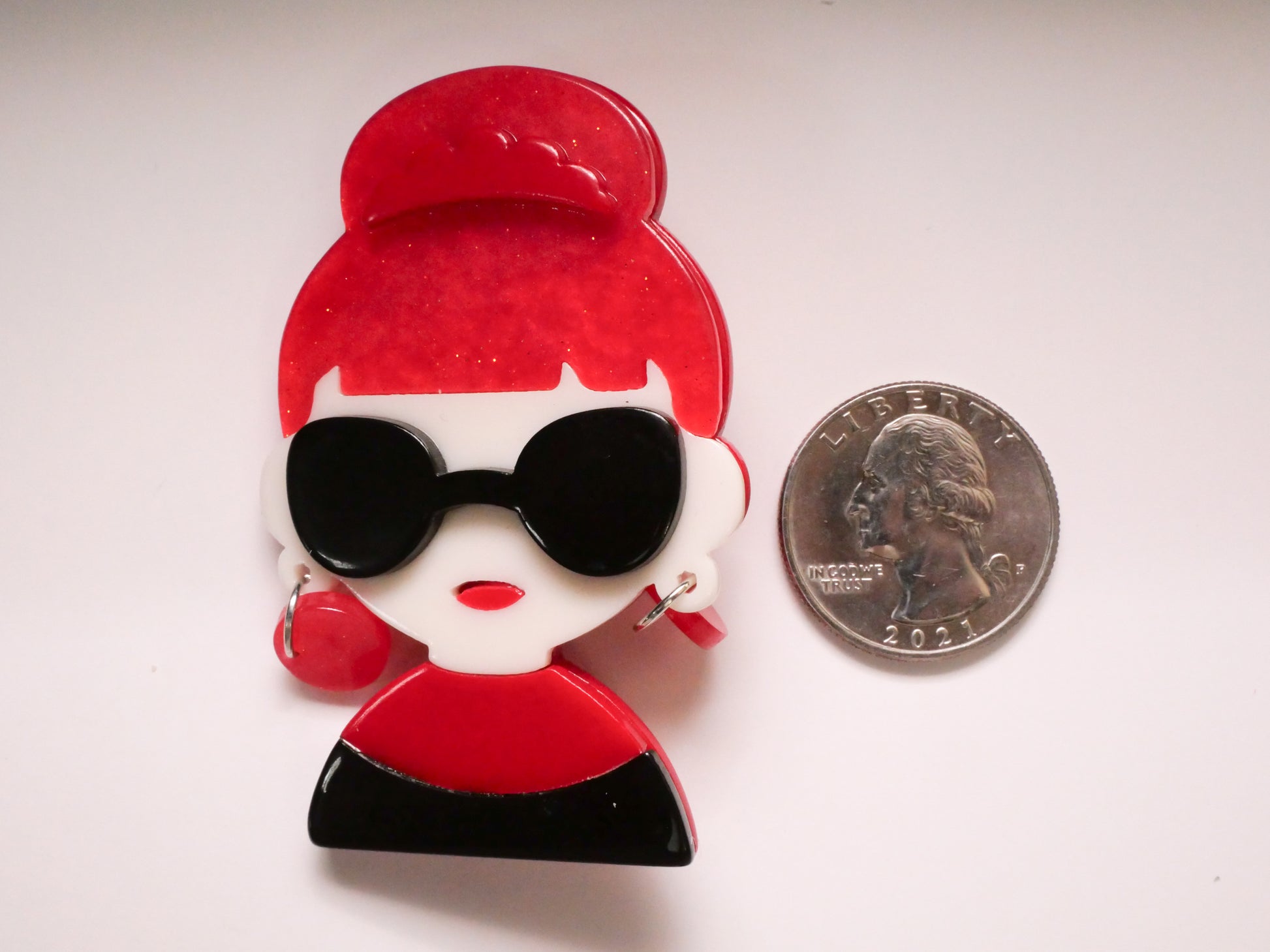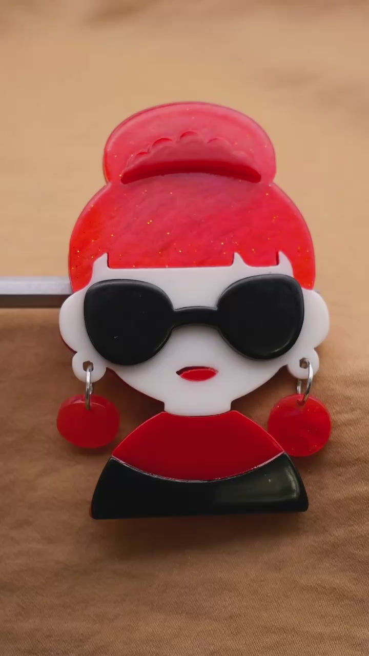 Cute Aubrey Hepburn look red and black acrylic plastic button with dangling MOVEABLE earrings. Large size measures 41 x 64mm / 1.61" x 2.52".