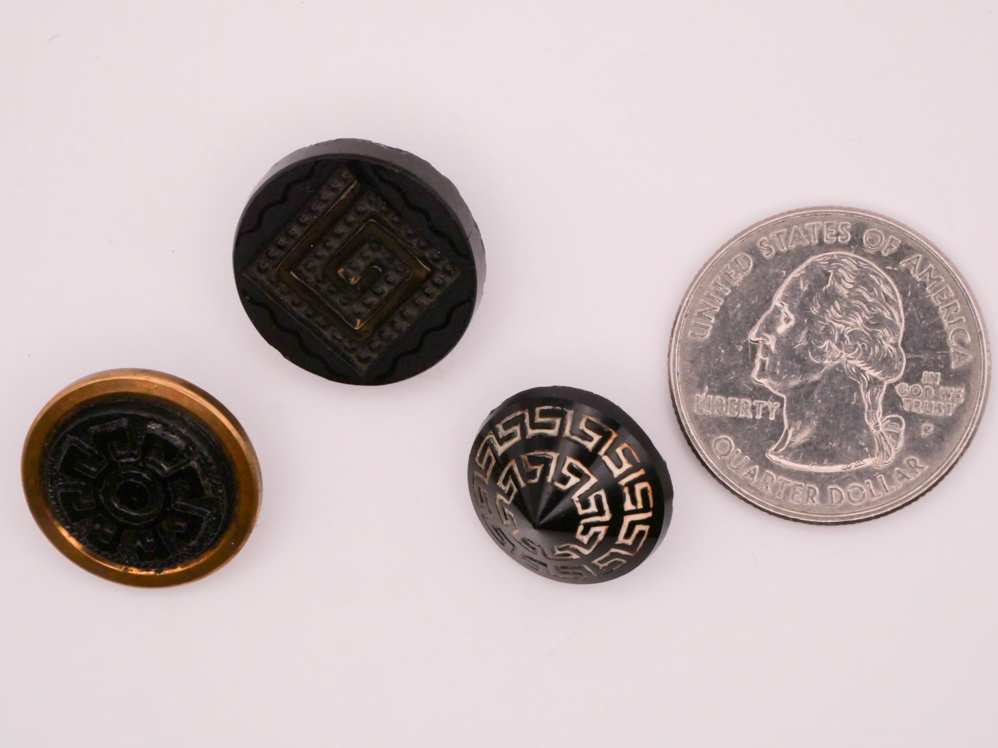 Very cool Aztec or Greek key inspired antique black glass buttons. Left has glass on metal setting. Center has subtle shadow design around edge and backmark that I think reads "IIIIV". That one does have some chipping on back edge. Right is conical shaped and has white applied to the Greek key design. These measure between 16-19mm / .63"-.75". Choose left, center, or right.