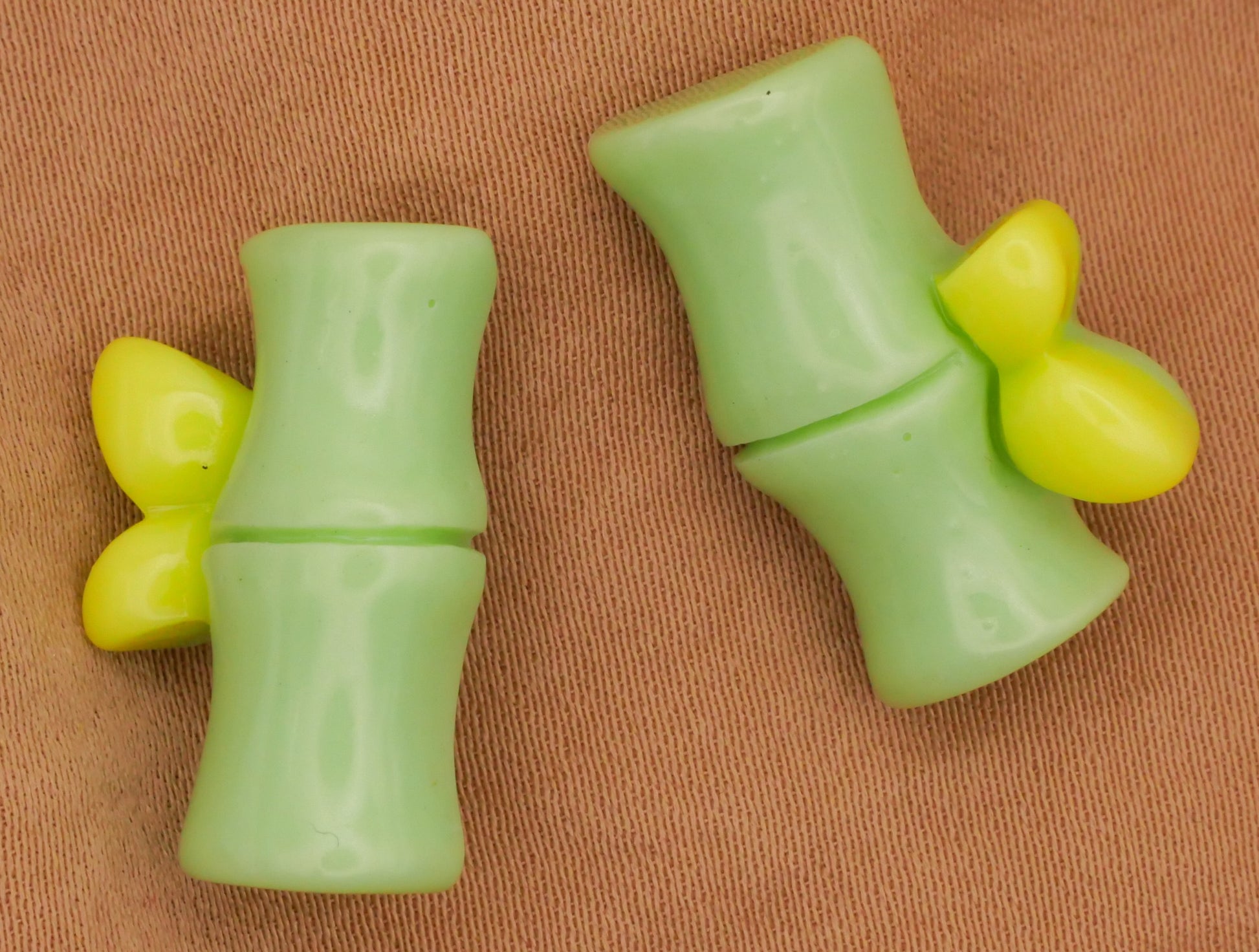 Cute pair of two plastic bamboo buttons! Each measures 13 x 21mm / .51" x .83".