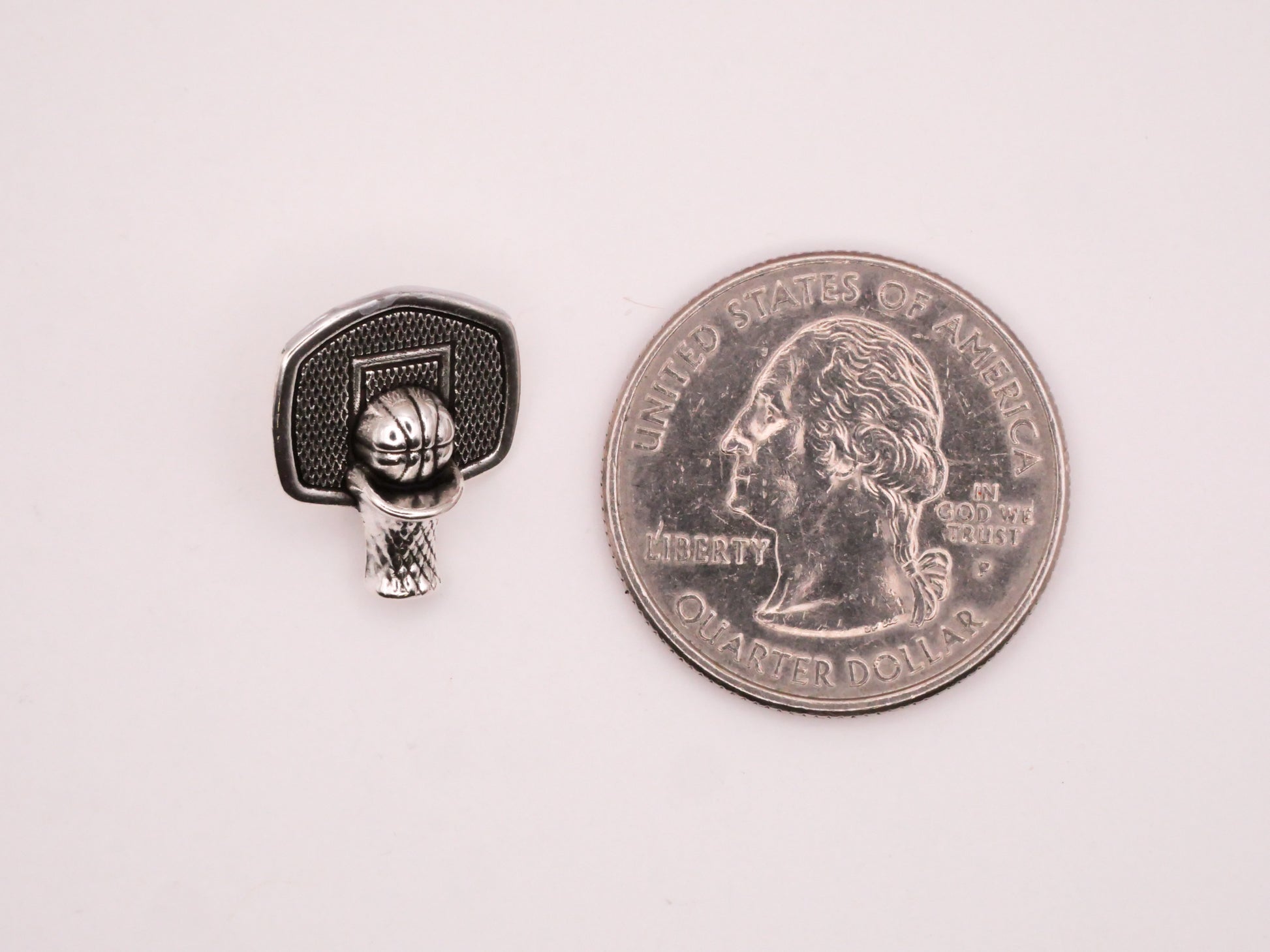 Fun realistic silver metal basketball and hoop! Measures 14 x 16mm / .55" x .63".