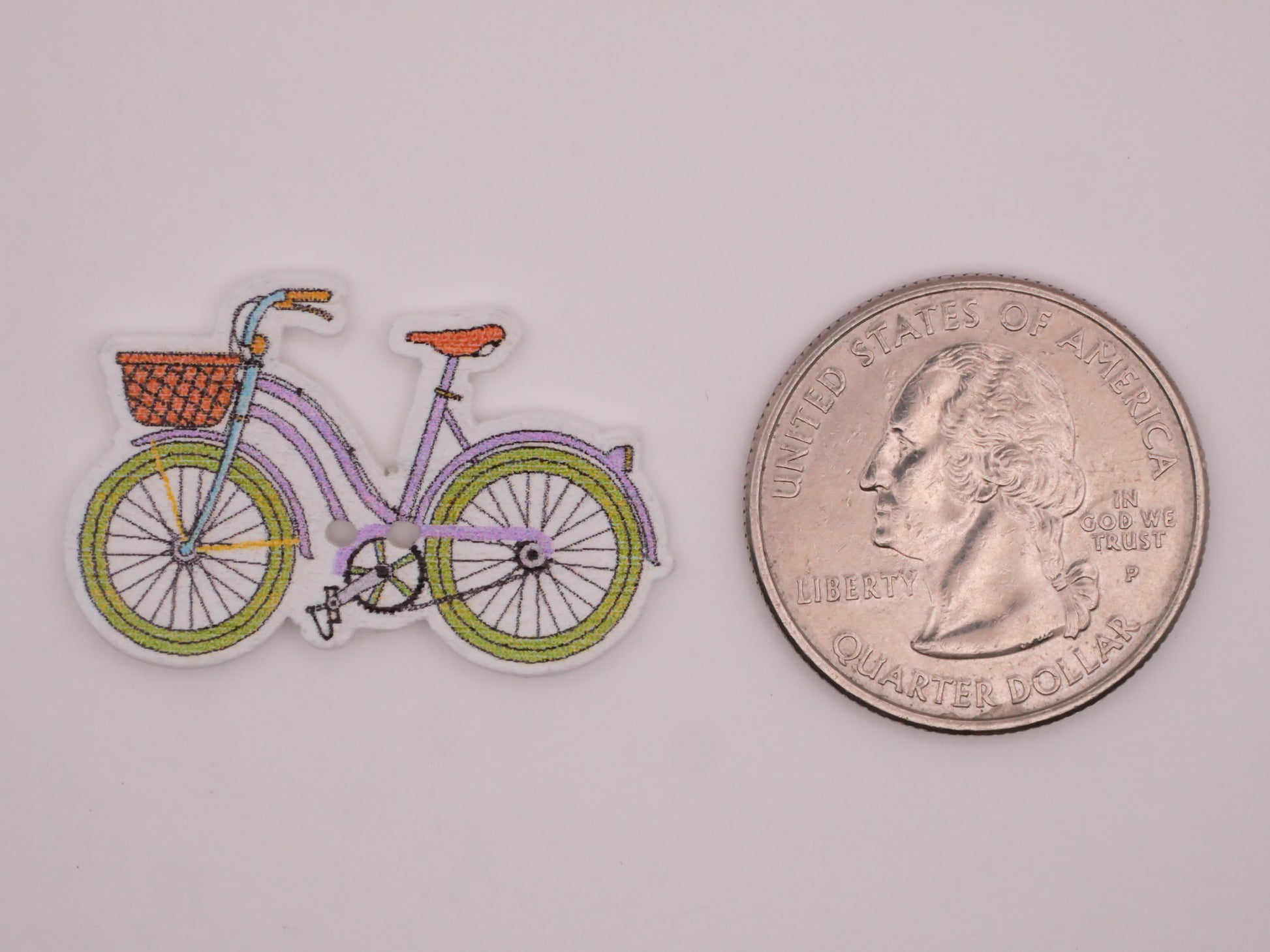 Fun bicycle bike with basket set of ten assorted wood buttons. Each button measures 21 x 32mm / .83" x 1.26".