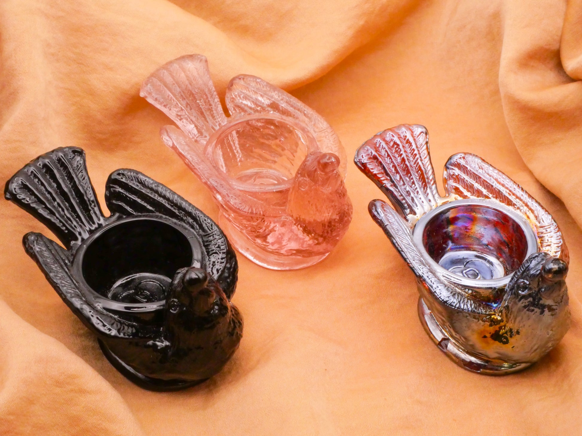 Beautiful glass bird salt dip / salt cellar, votive holder, or button display. Comes with assorted white and clear plastic buttons. Cute! Measures 1.75" x 3". Choose left (black), center (translucent lavender), or right (iridescent).