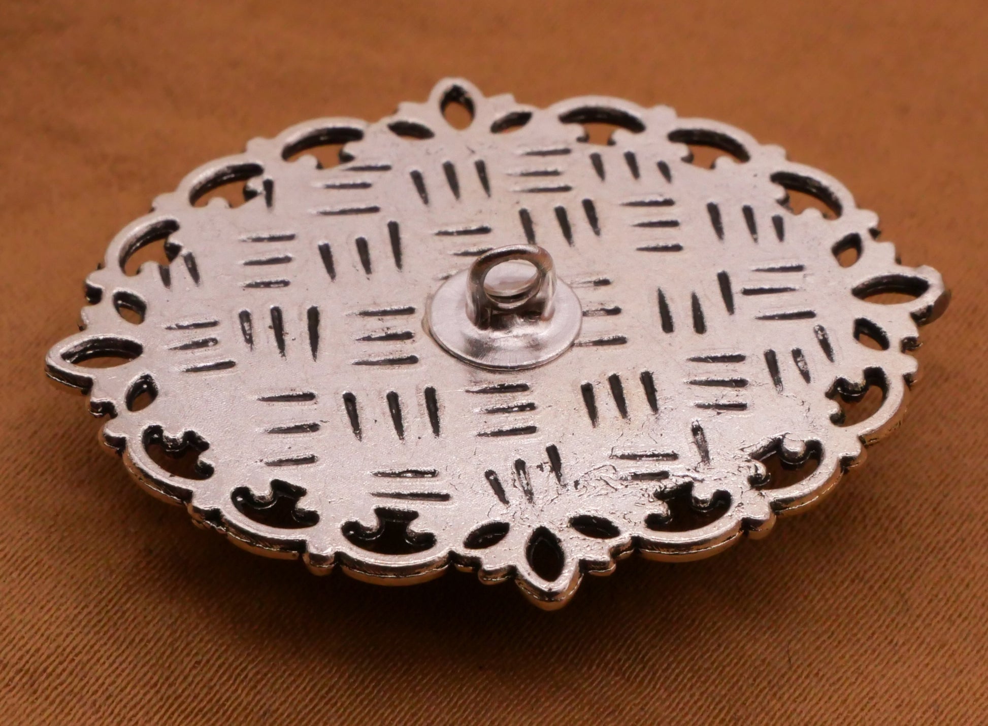 Adorable black haired girl with black kitty cat under glass in silver lacy metal setting. Large button measures 30 x 36mm / 1.18" x 1.42".