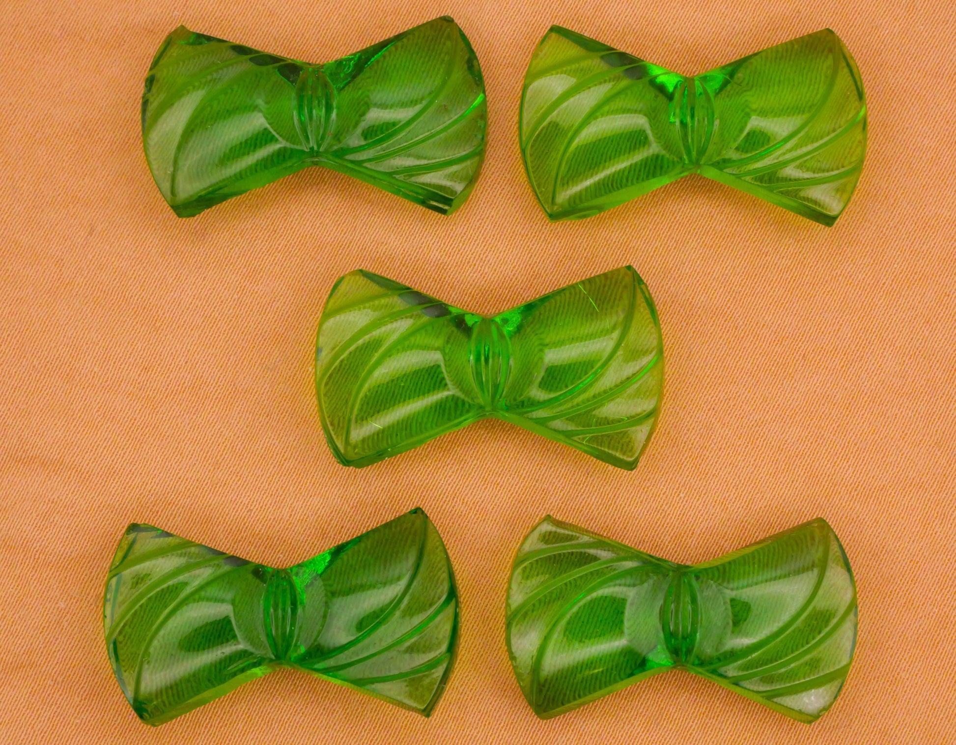 Love! Translucent green glass bow design buttons. Some of these do have small chips along edges or on the back so please see photos. These measure 16 x 27mm / .63" x 1.06". Choose top, middle, or bottom and left, center, or right.