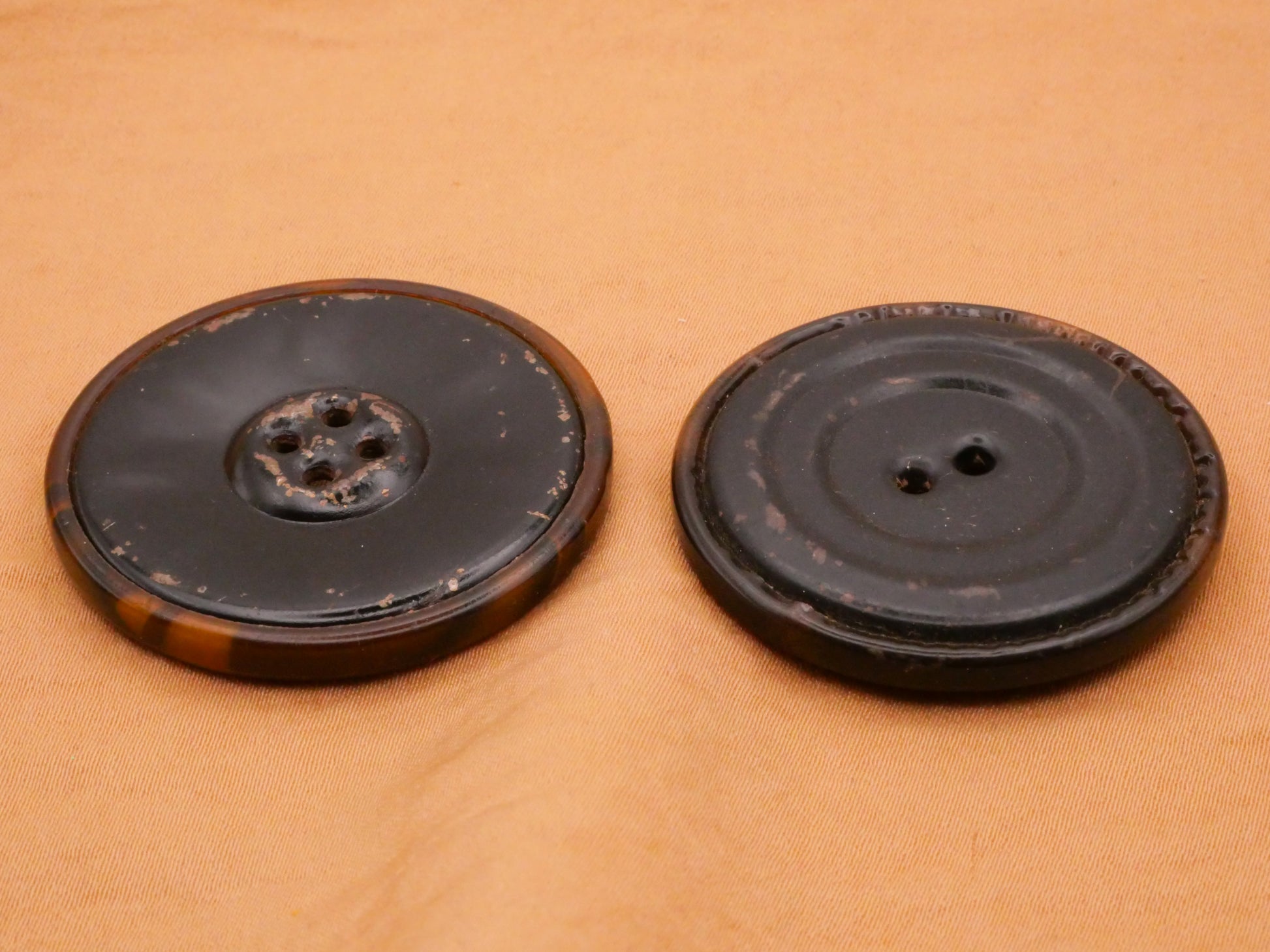 Two handsome brown celluloid early plastic tight top designs. Choose between plaid design or hexagon. These large buttons measure 37-38mm / 1.46"-1.5". Choose left or right.