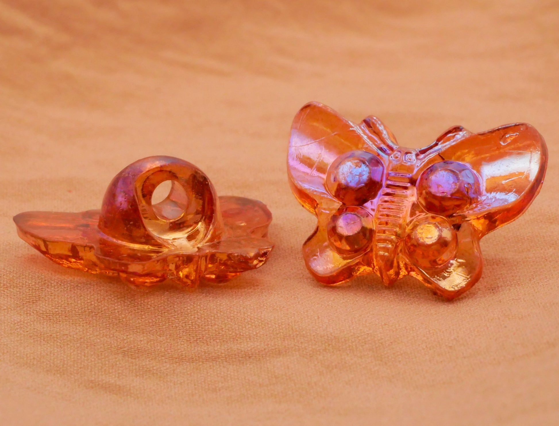 Pretty! Iridescent amber colored plastic butterfly buttons, darling! Sold in set of four. Each measures 16 x 22mm / .63" x .87".