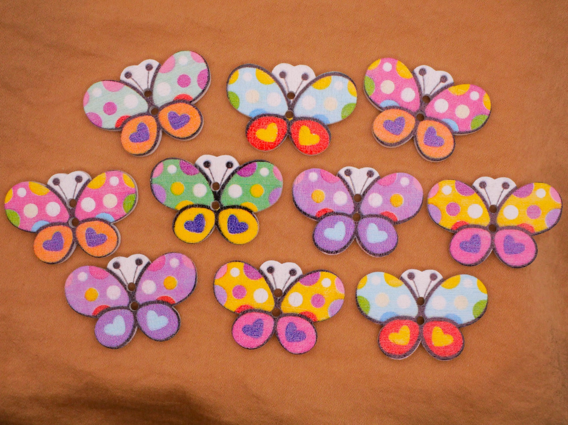 Fluttering wood butterfly buttons with polka dots and hearts on the wings. Sold in assorted set of ten. Each button measures 20 x 30mm / .79" x 1.18".