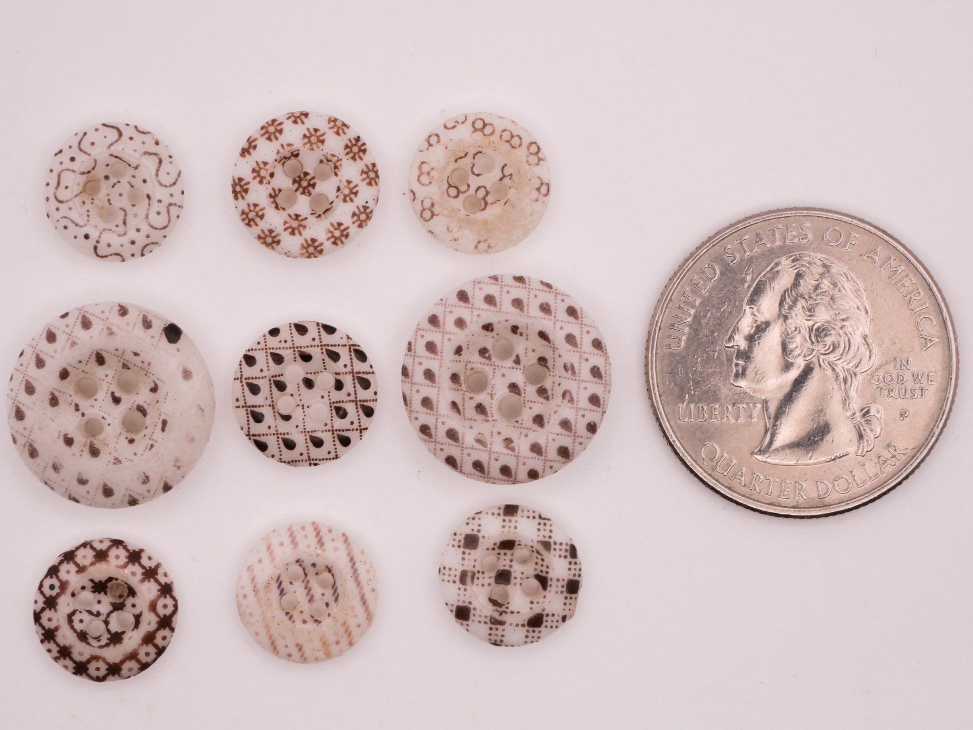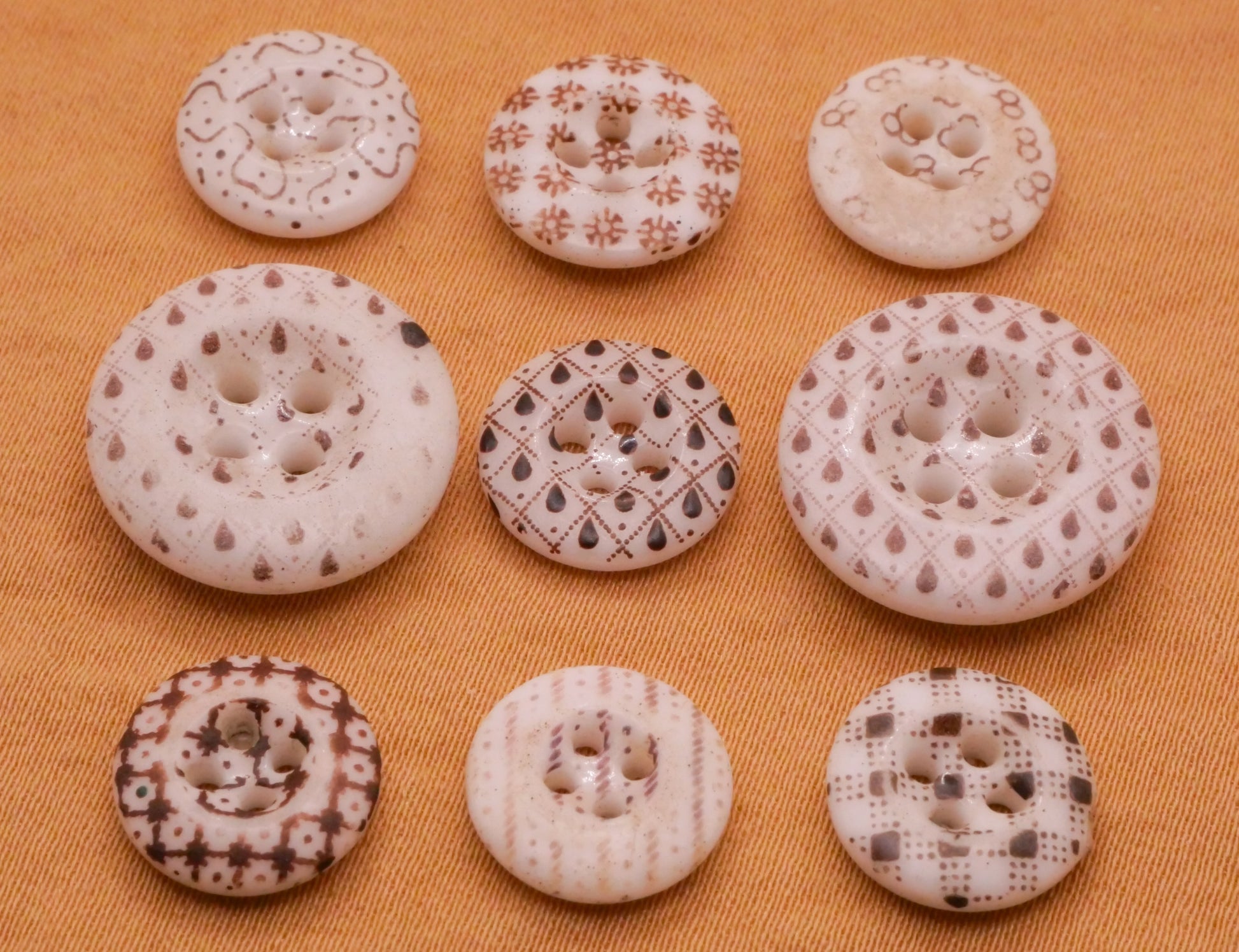 Lovely calico china buttons with brown patterns, choose your favorite. These measure between 11-16mm / .43"-.63". Choose top, middle, or bottom and left, center, or right.
