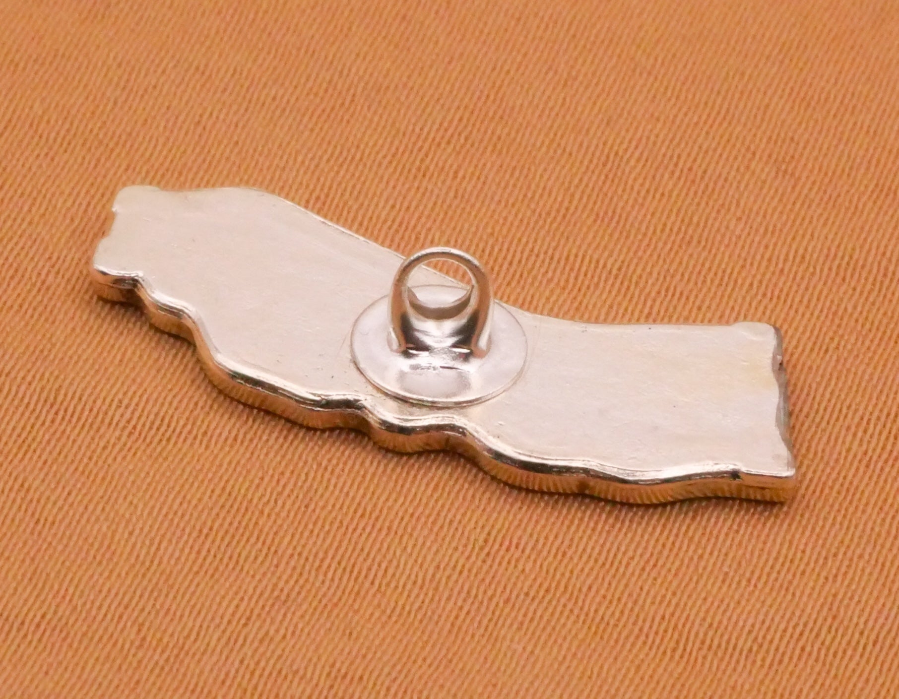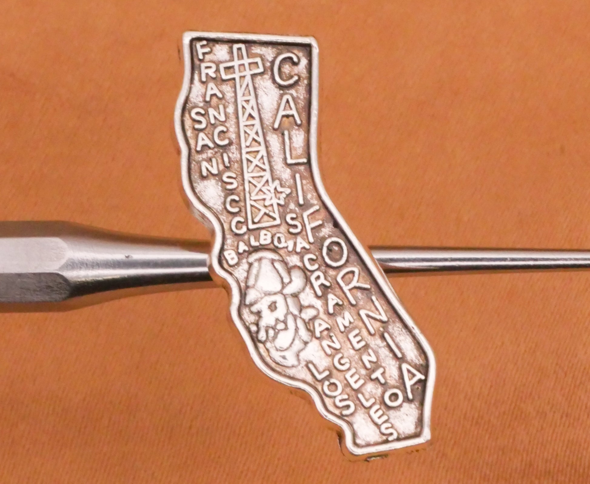 Amazing verbal California state map button with San Francisco, Sacramento, Balboa, and Los Angeles. Silver metal button measures 12 x 25mm / .47" x .98".