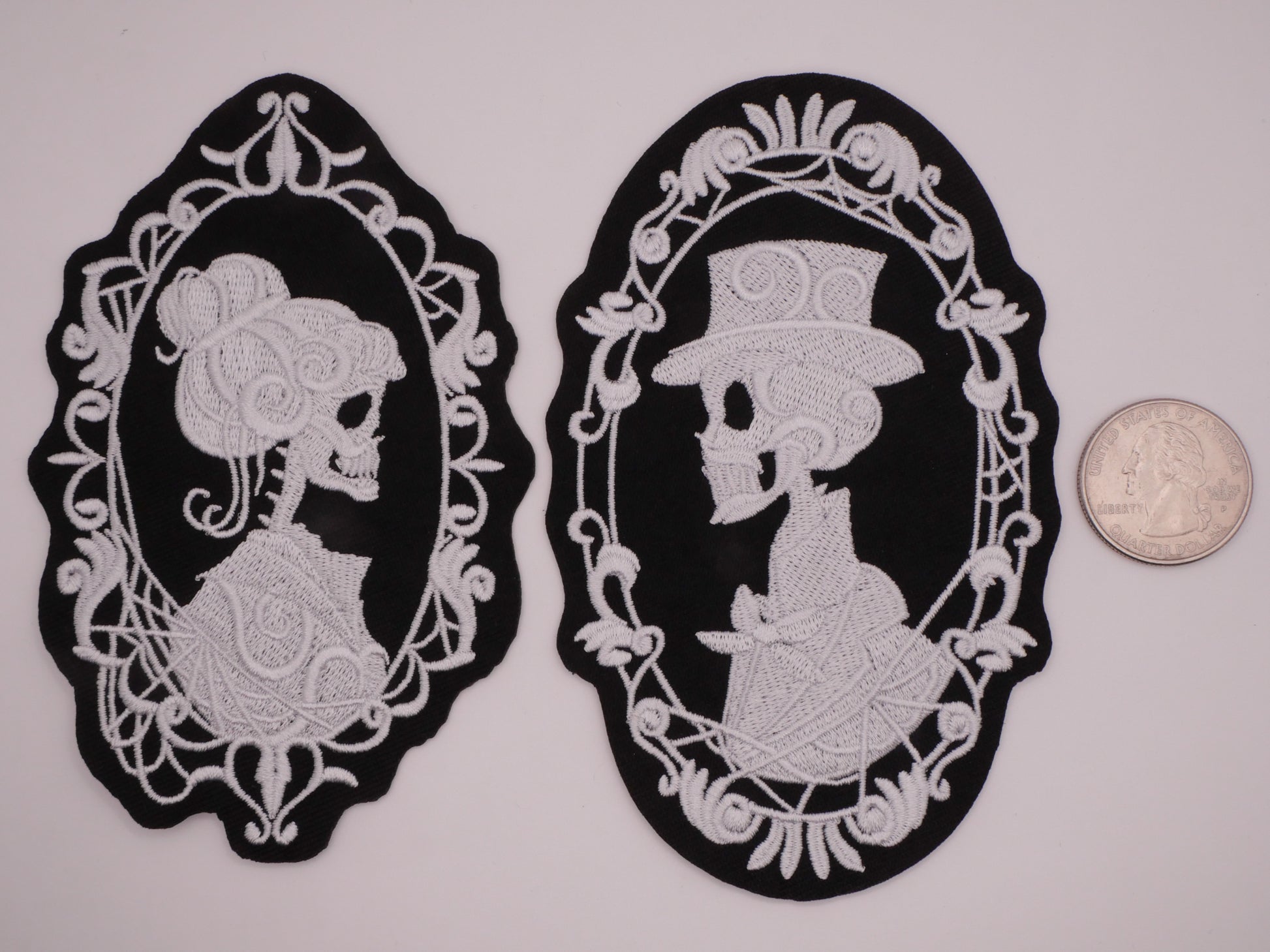 Patches to go with the matching buttons! Lady and gentleman skeleton skull cameo look design embroidered iron-on patches. Sold as pair with one of each style. Large size measuring between 75-121mm / 2.95"-4.76".