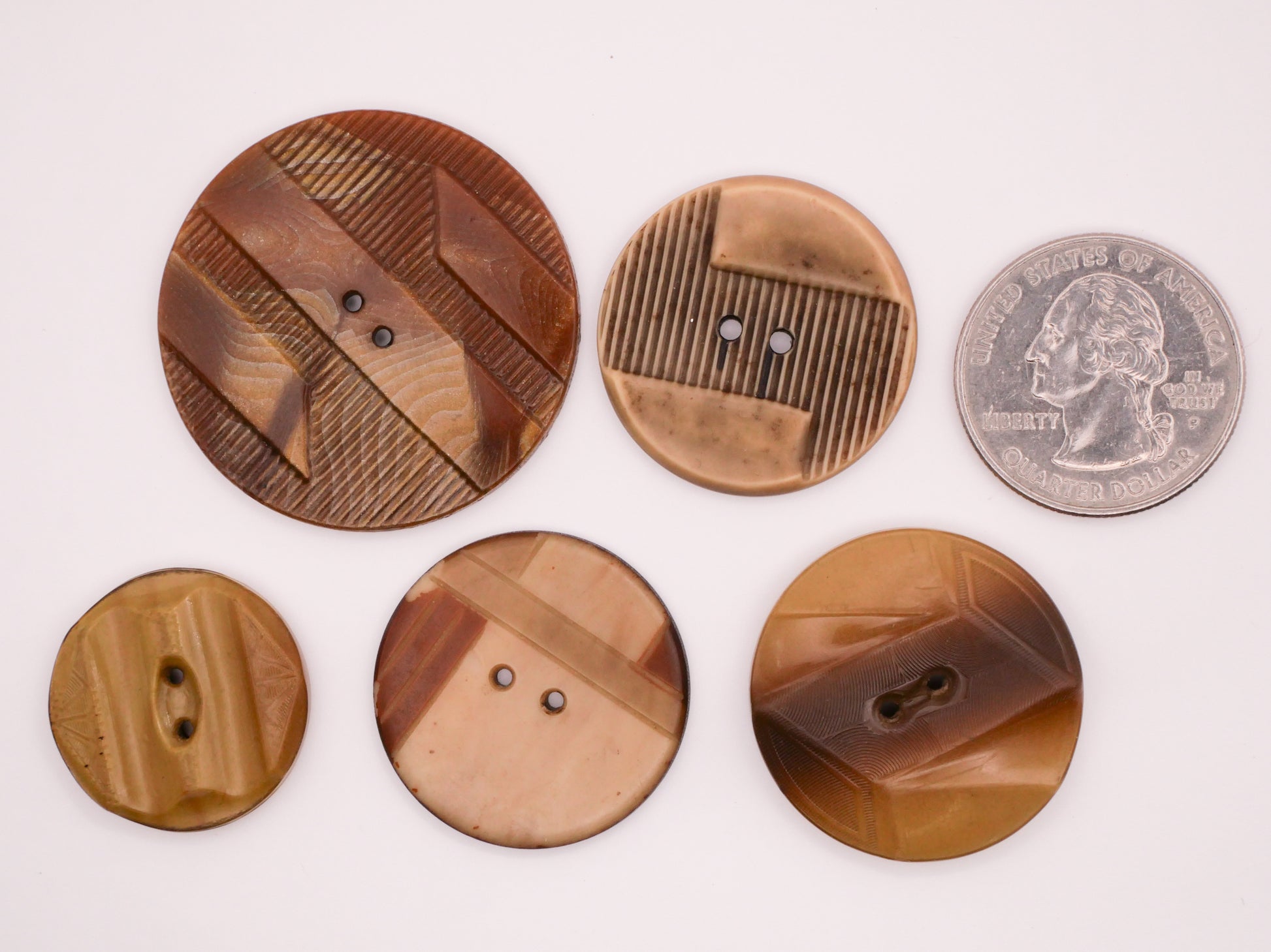 Handsome art deco design celluloid early plastic buttons in shades of tan and caramel. These measure between 23-37mm / .91"-1.46". Choose top or bottom and left, center, or right.