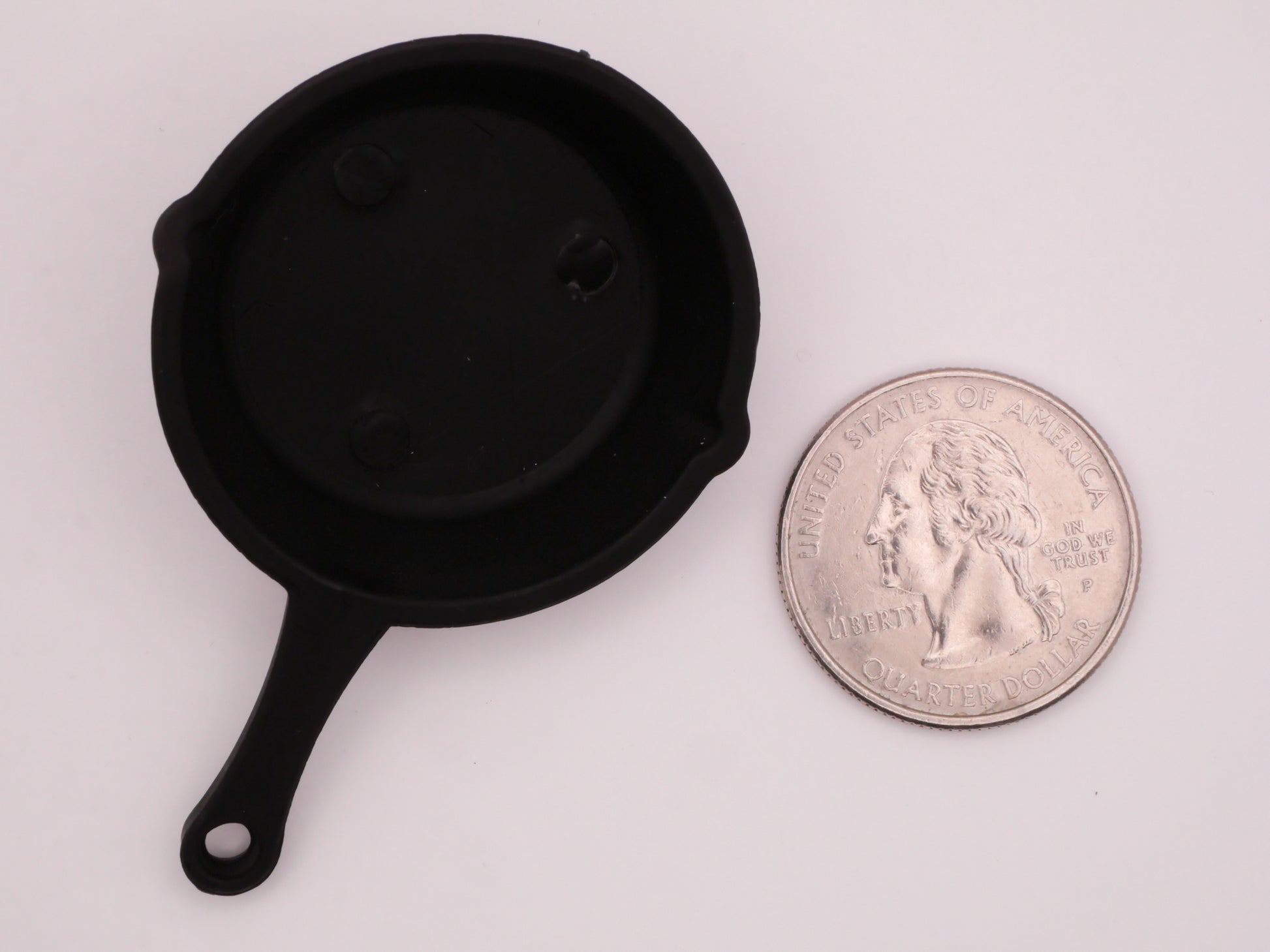 Fun black plastic button that looks like a cast iron skillet. Large size measuring 41 x 59mm / 1.61" x 2.32".