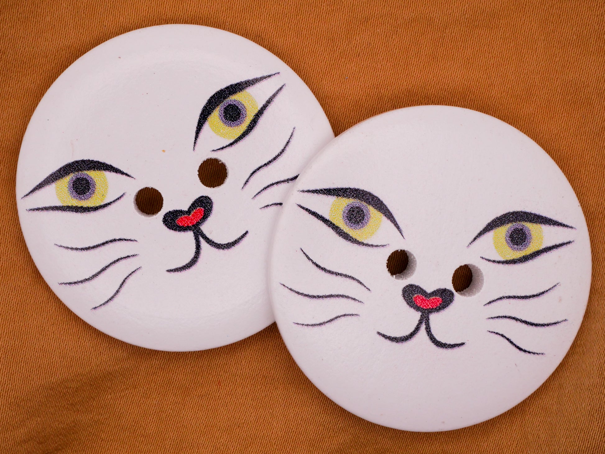 So sweet! White kitty cat face on a large wooded button. Sold in pairs. Each button measures 40mm / 1.58" in diameter.