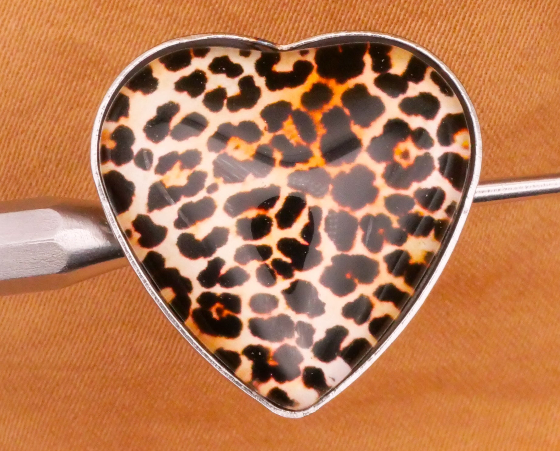 Fun leopard or cheetah print design plastic and metal heart button. Measures 21mm / .83" across.