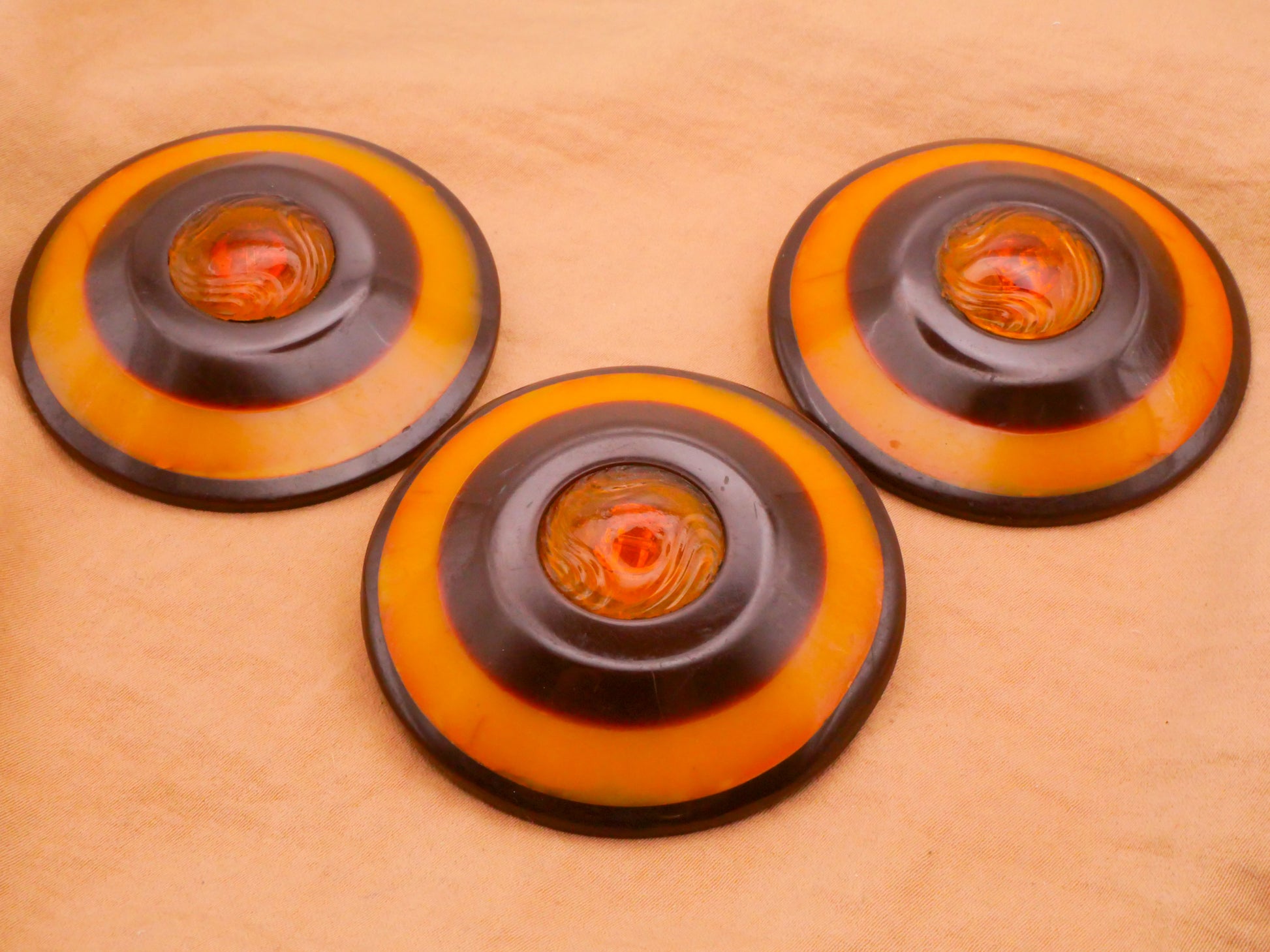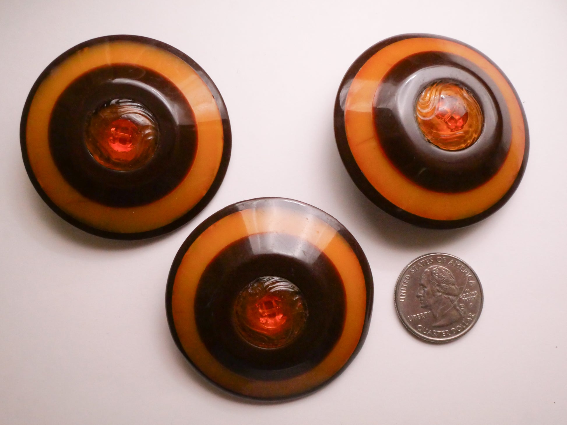 Interesting and very large early plastic buttons! Brown and caramel rings with a art nouveau design center medallion. These measure a substantial 55mm / 2.16" in diameter. Choose left, center, or right.
