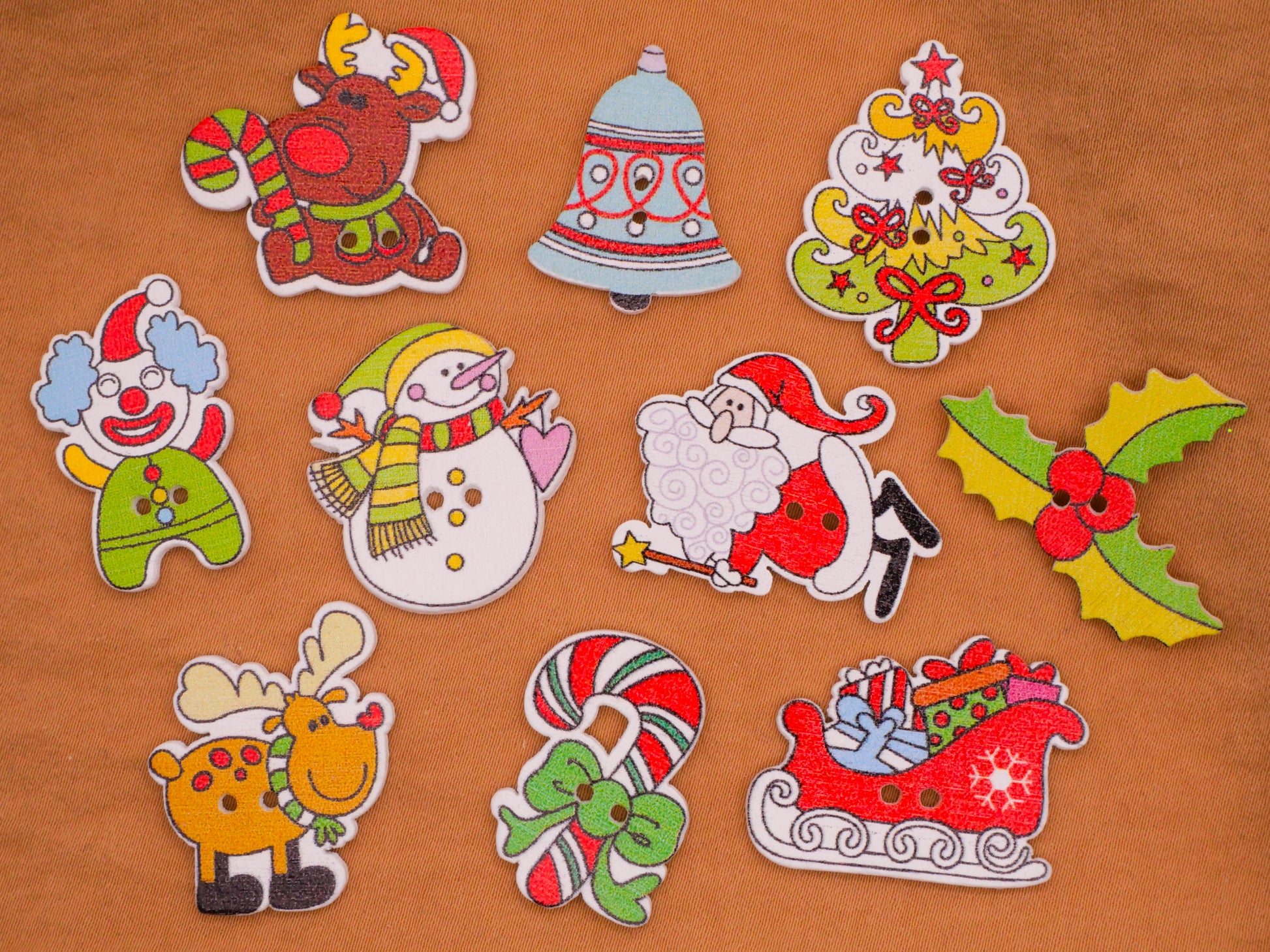 Christmas Motif Festive Wood Assorted Set of Ten Buttons 19-30mm