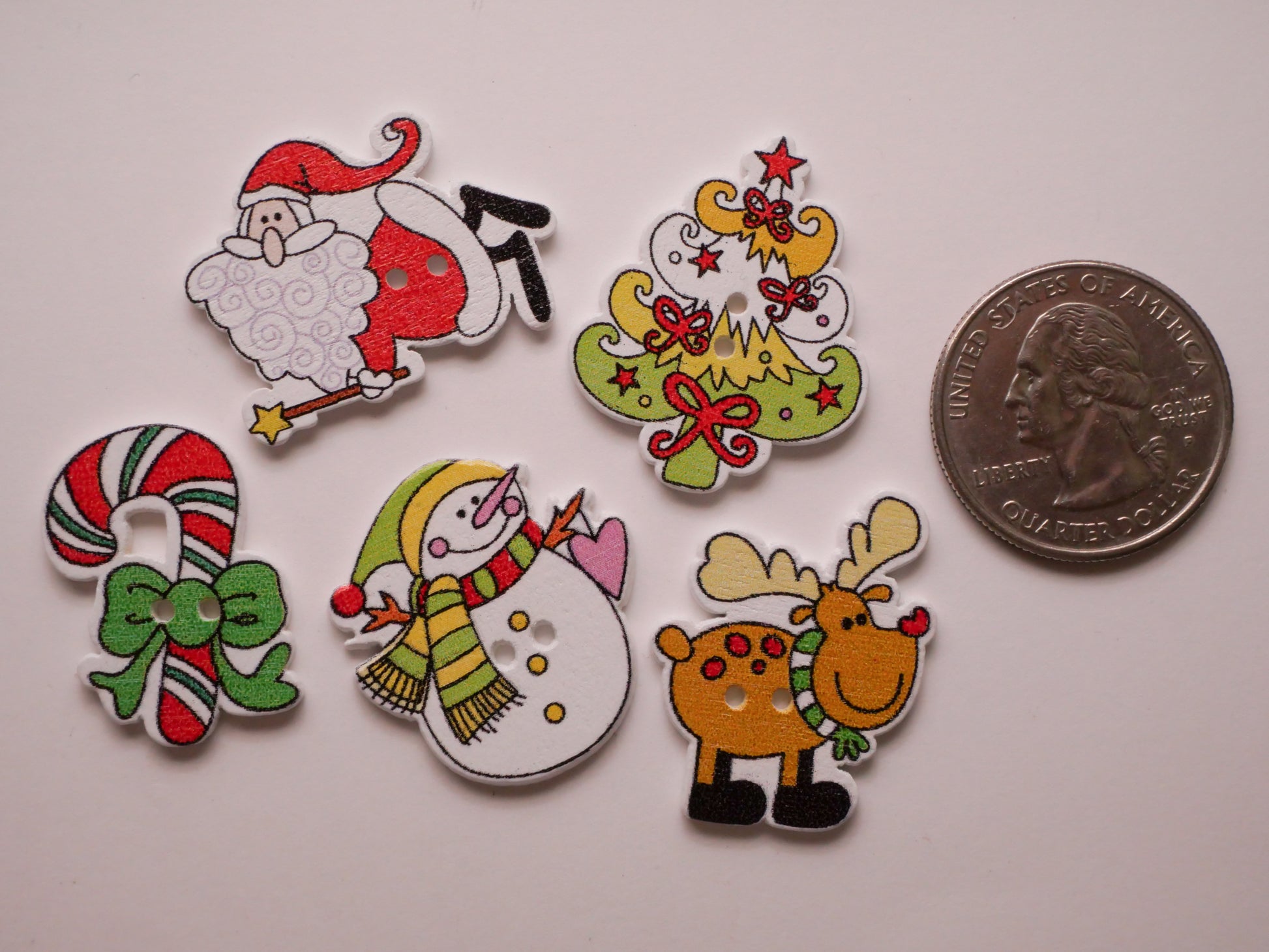 Such fun! Get in the Christmas spirit with these cute wood buttons. Perfect to add to gift packaging. Sold in assorted set of ten. These measure between 19-30mm / .75"-1.18".