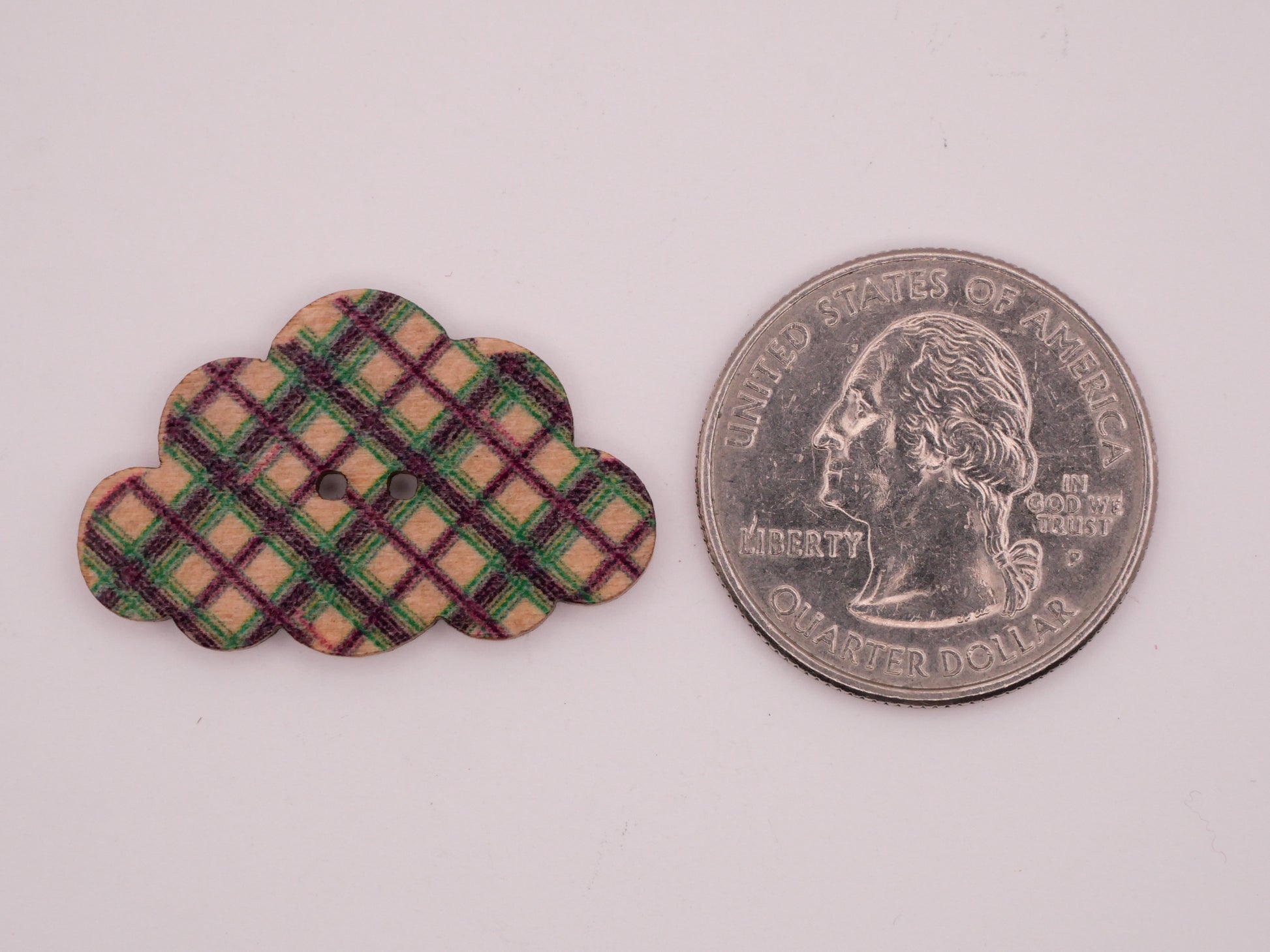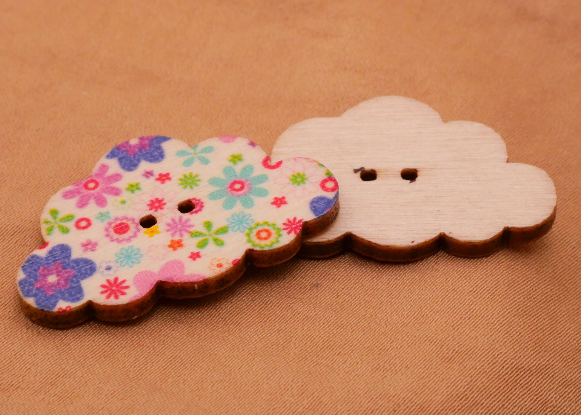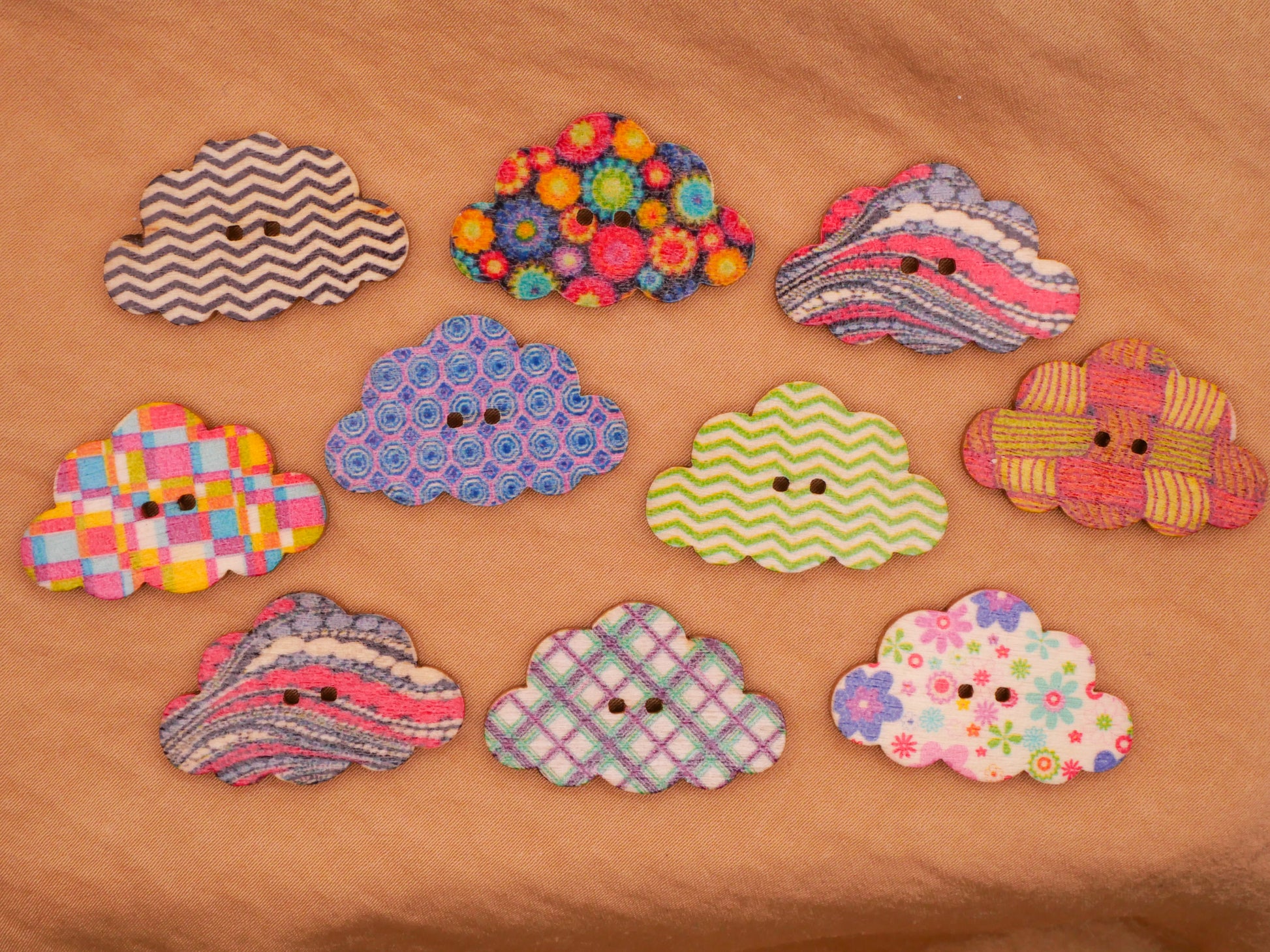 Colorful cloud buttons covered in fun patterns. Sold in assorted set of ten. Sets will vary in patterns. Each wood button measures 19 x 30mm / .75" x 1.18".