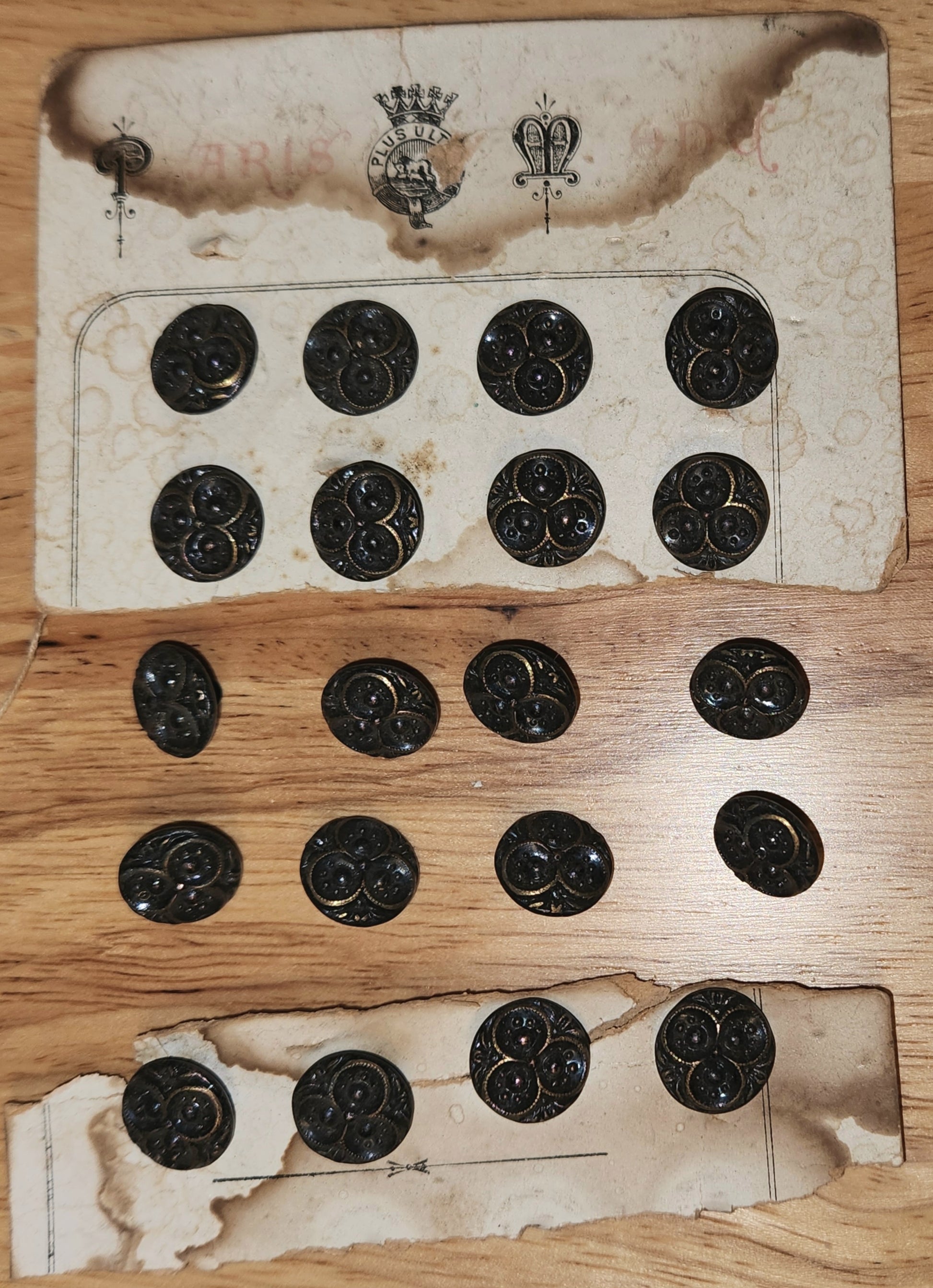 Very pretty clover design on this French / Paris Victorian button. I was lucky enough to find a card of these, which was quite destroyed, but I'll include a picture. Reads Paris Mode (maybe the brand Mode de Paris?) and in center seal it reads "Plus Ultra" which was used on French buttons after 1840 and through the end of the 1800s and roughly translates "Nothing Better". Love these! Each measures 14mm / .55" in diameter.