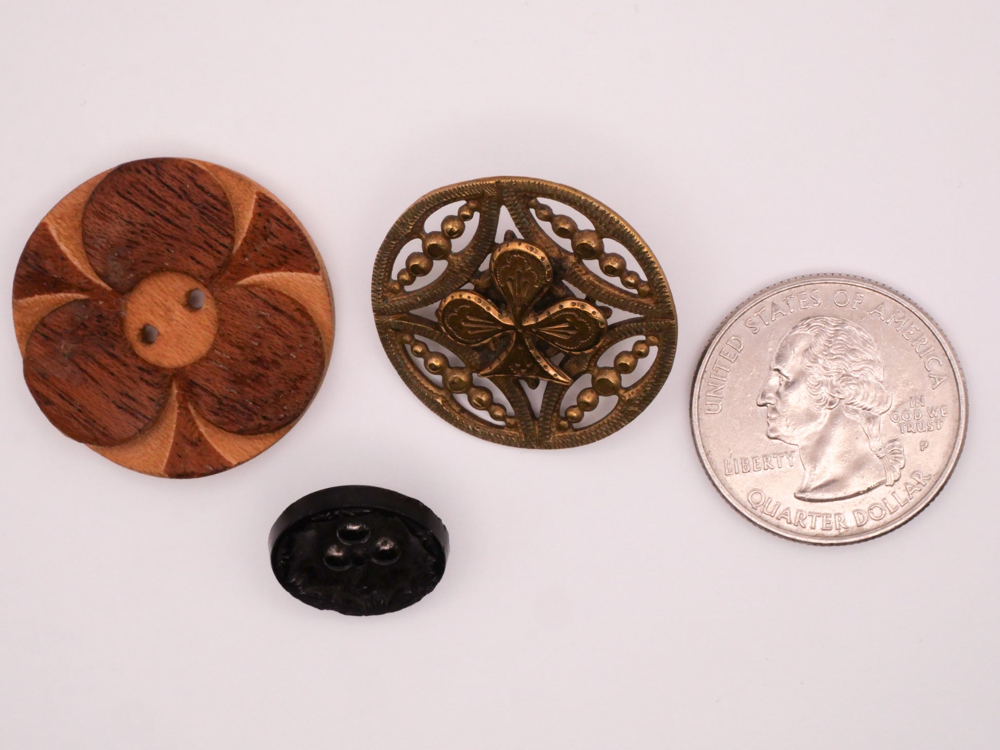 Amazing club suit or three leaf clover buttons, choose your favorite! Left is two tone wood, center is black glass, and right is brass metal. These measure between 16-29mm / .63"-1.14". Choose left, center, or right.