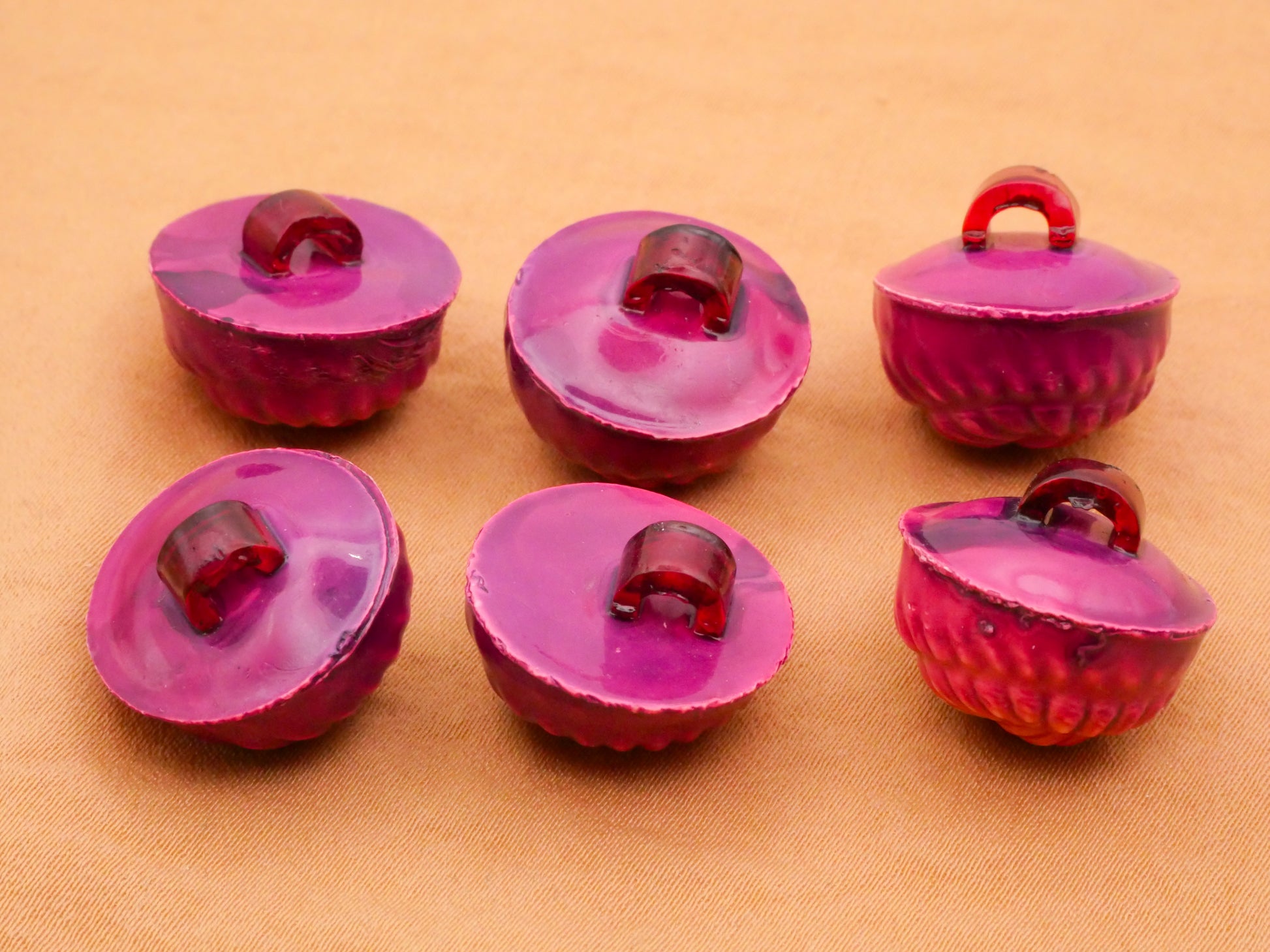Beautiful magenta pink rope coil look celluloid bubble buttons, choose your favorite! Each measures 19mm / .75" in diameter. Choose top or bottom and left, center, or right.
