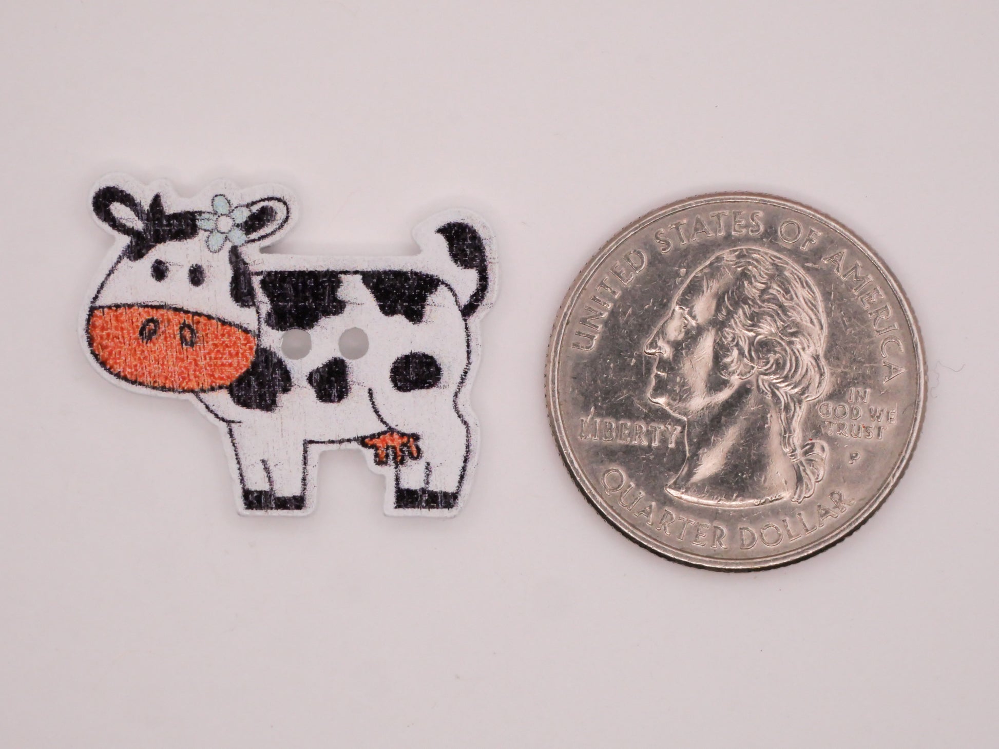 Sweet cows with colorful snouts. Sold in assorted set of ten. Each wood button measures 21 x 28mm / .83" x 1.1".
