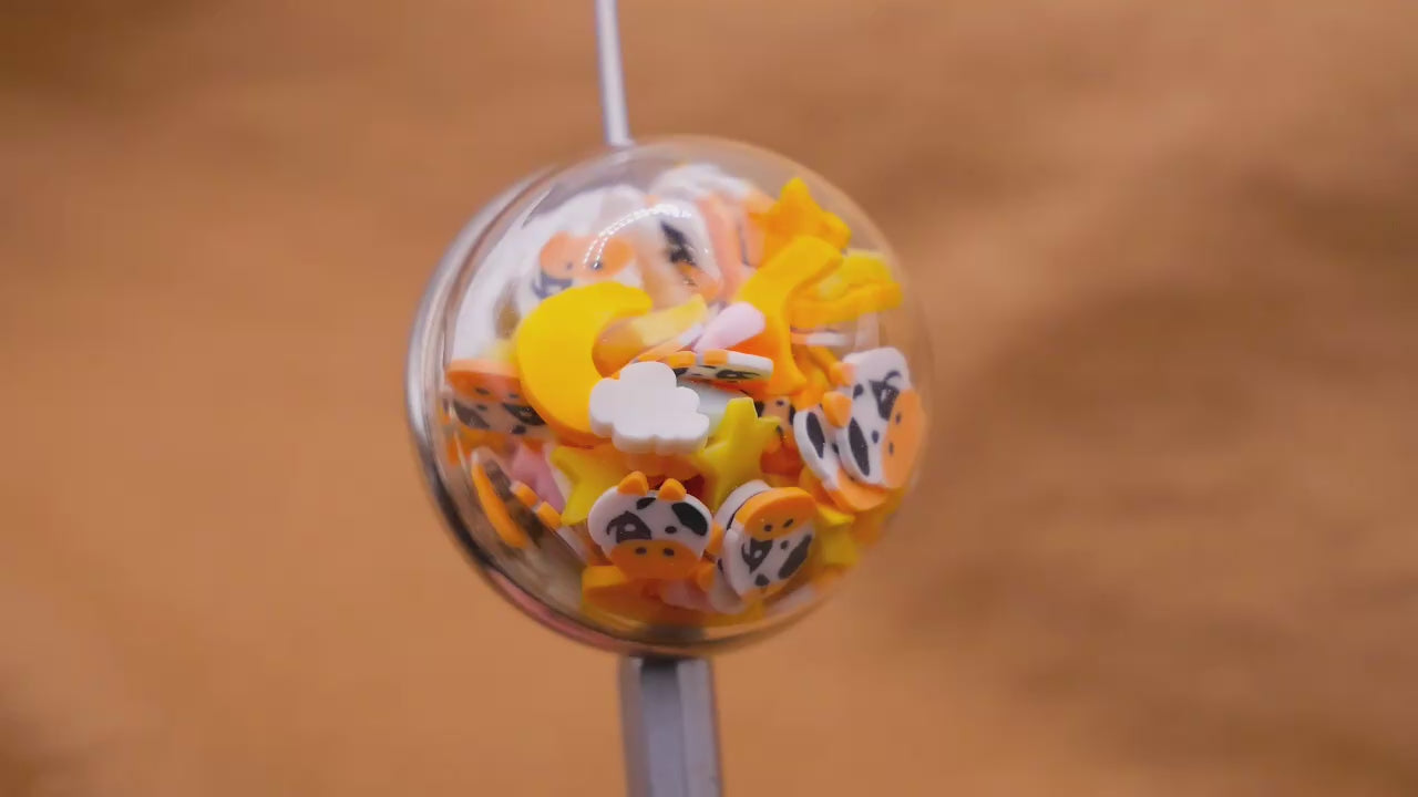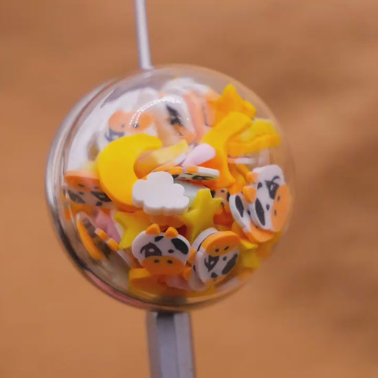 Cute nursery rhyme button! Cow jumped over the moon themed moveable snow globe like moveable button with cows, moons, stars, and clouds inside. Measures 27mm / 1.06" across.