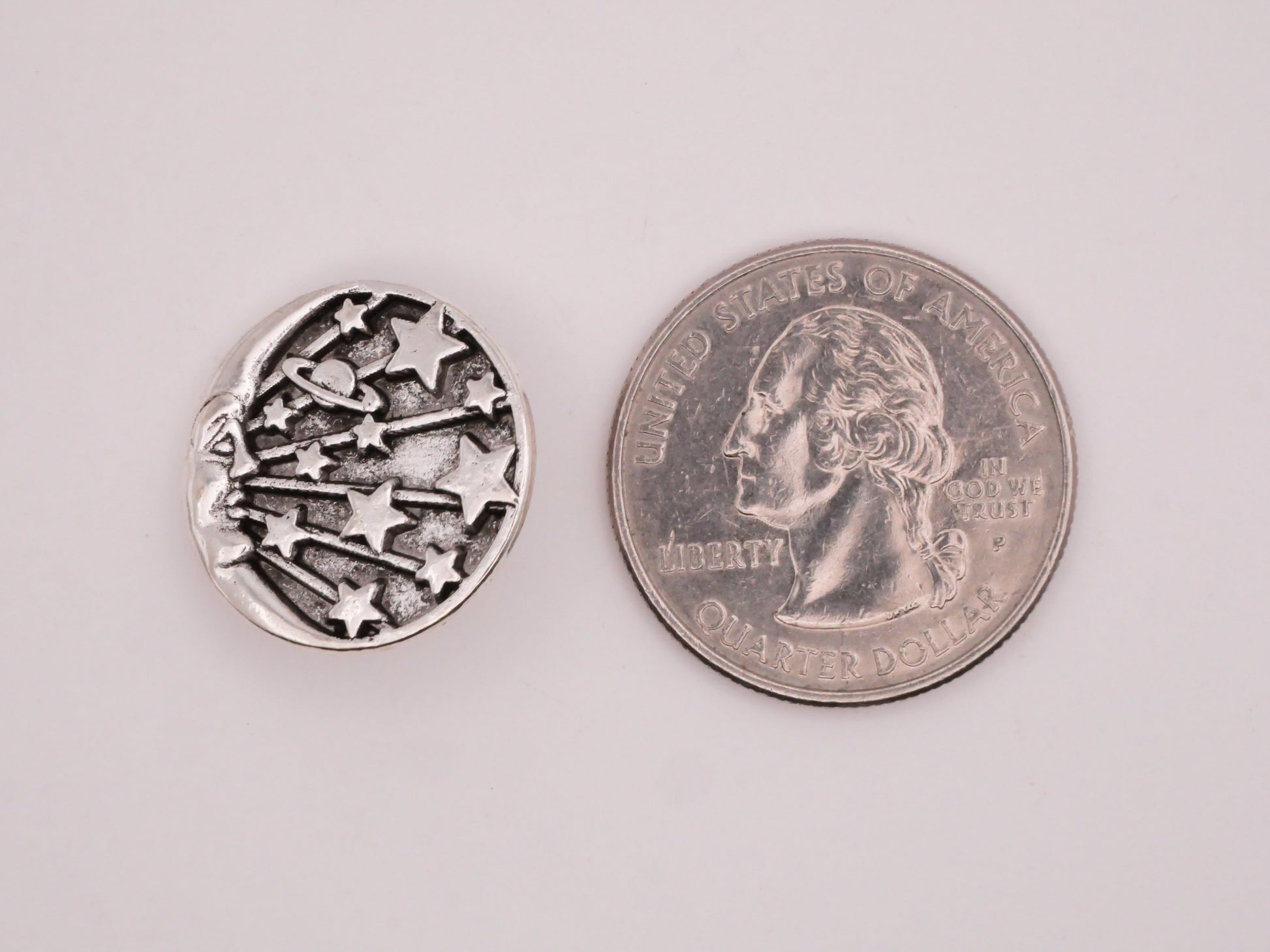 My favorite! Crescent man on the moon with stars and planet. Silver metal button measures 19mm / .75" in diameter.