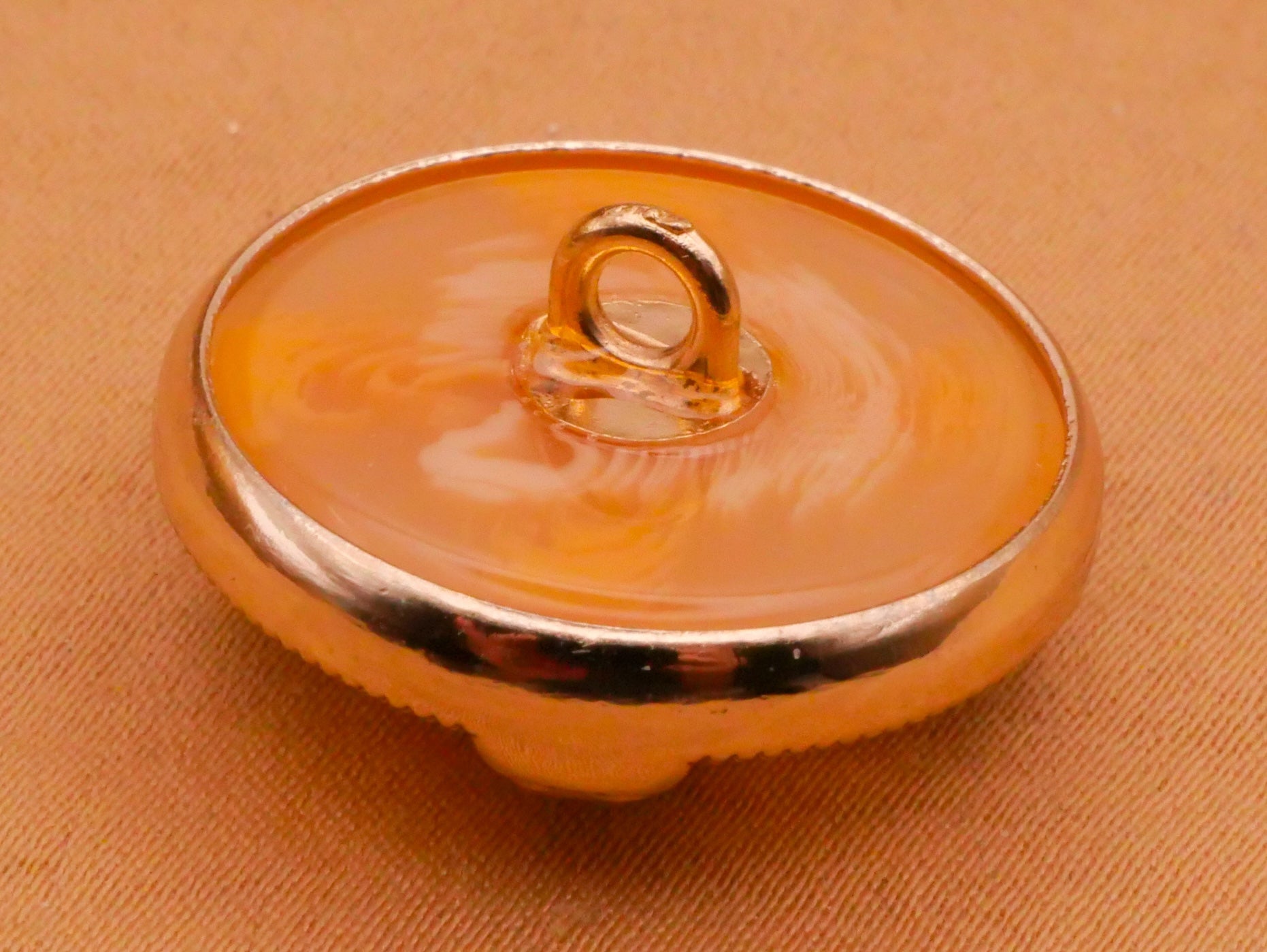 Interesting and beautiful, reminds me of the top of a crown. Mixed material with champagne colored plastic, gold metal cross, and iridescent rhinestones. Button measures 23mm / .91" across.