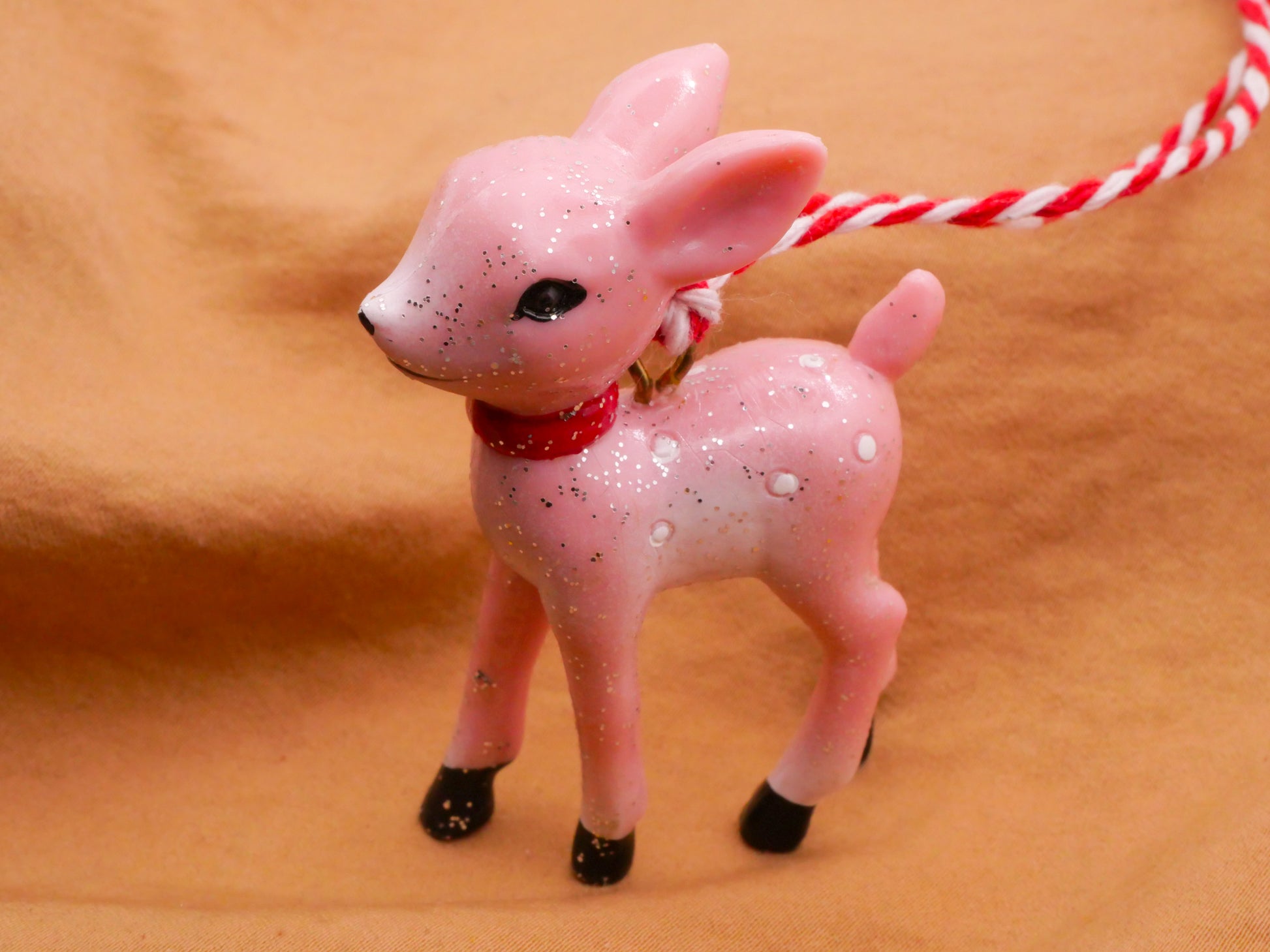 Too cute! Love this glittery pink deer fawn Christmas ornament inspired by the vintage ceramic figurines. Each plastic ornament measures 39 x 59mm / 1.54" x 2.32".