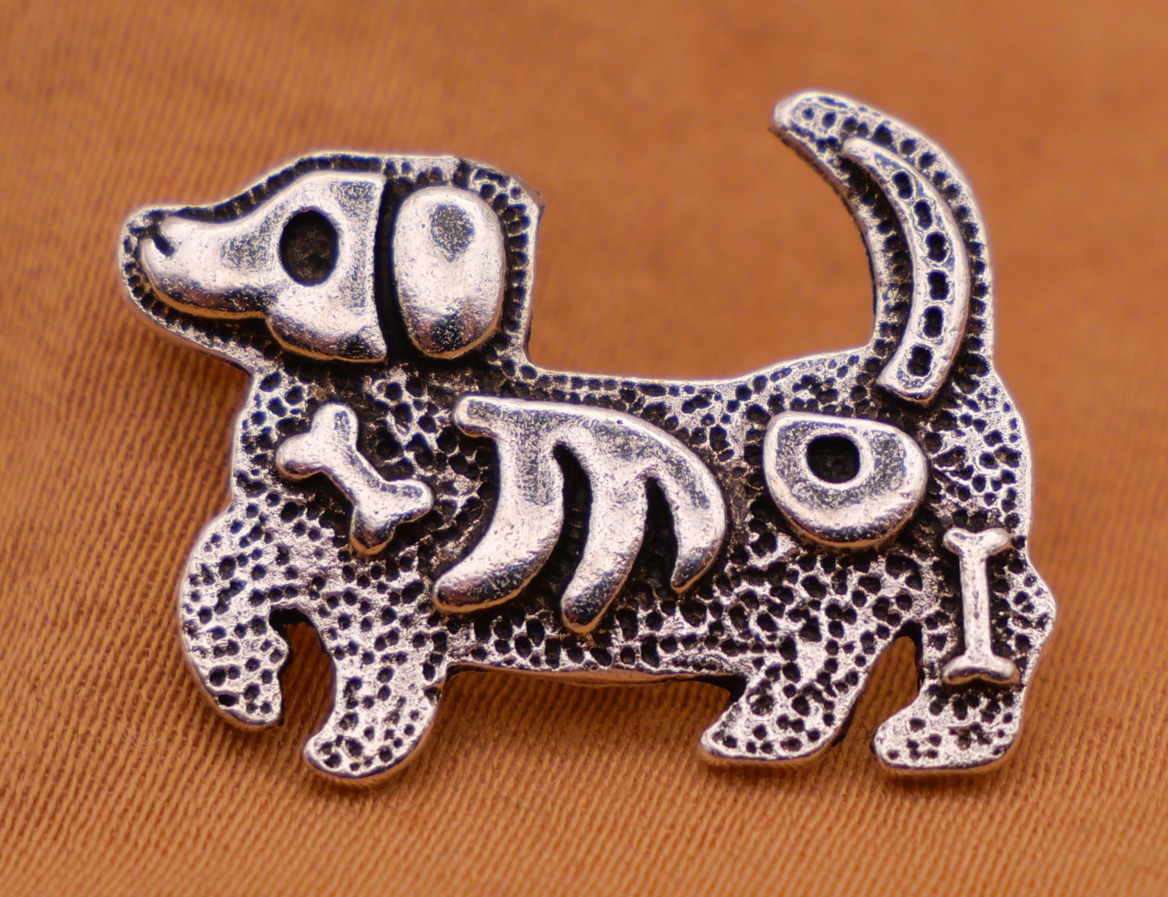 Most adorable dog skeleton silver metal button. Measures 16 x 21mm / .63" x .83".