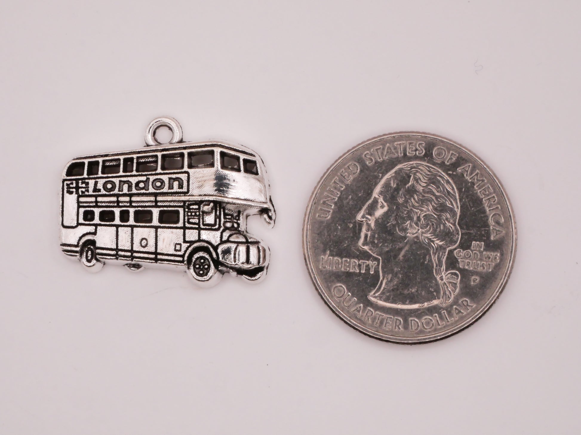 Excellent pair of London double decker bus charms / embellishments. Each silver metal charm measures 20 x 25mm / .79" x .98".