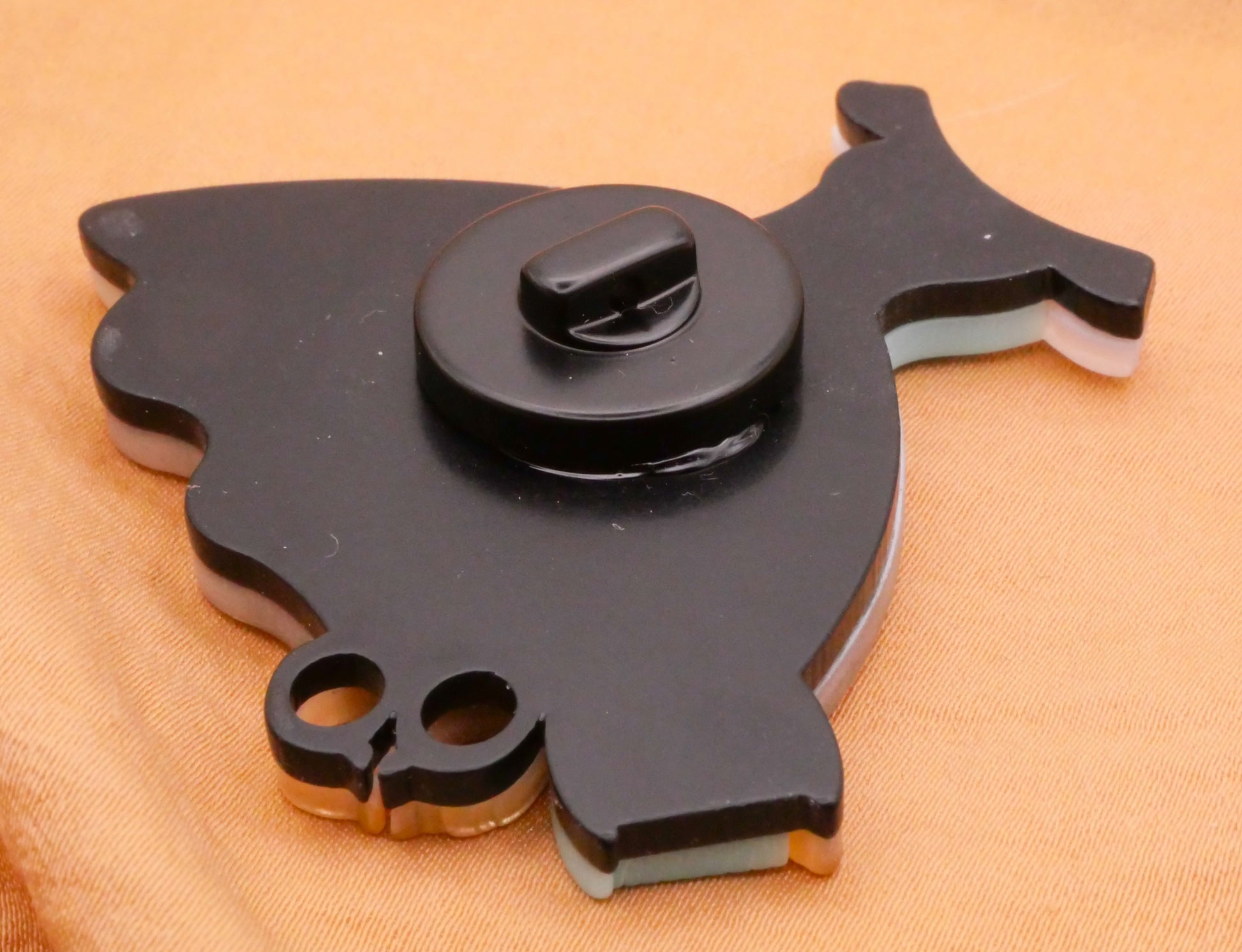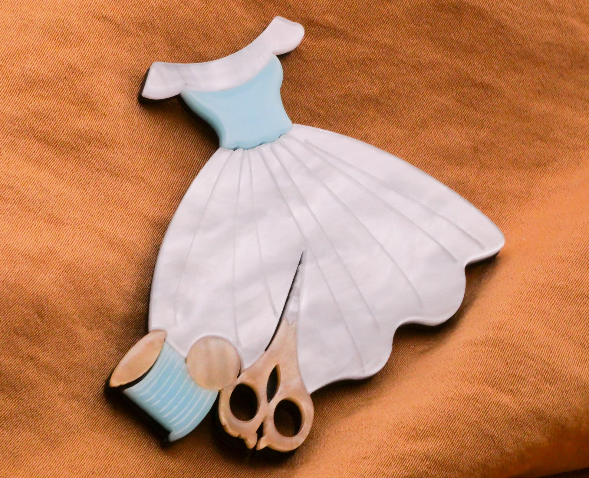 Fantastic Cinderella look dress with scissors and thread. Reminds me of the scene in the Disney movie where the mice and critters are making her a dress. Large acrylic plastic button measures 53 x 55mm / 2.09" x 2.17".