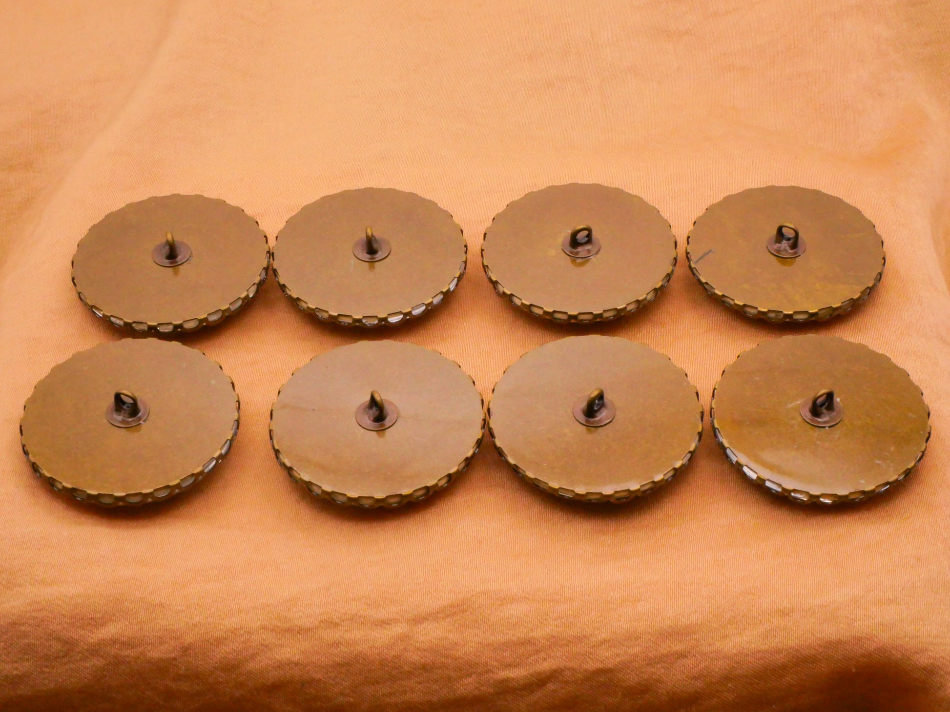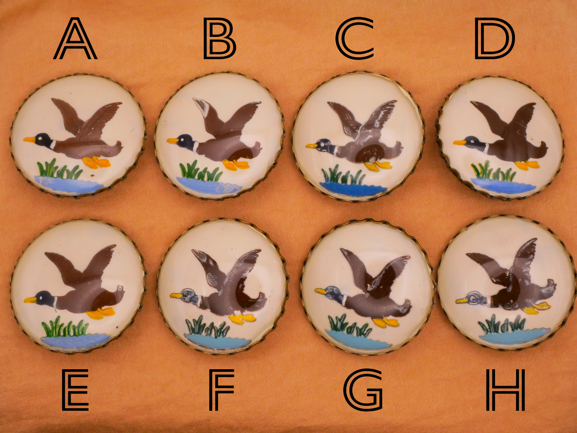 Excellent intaglio hand-painted glass and metal buttons with flying mallard duck. Please see photos for condition on each and choose your favorite. Note that D has some scratches on glass. These measure 31mm / 1.22" in diameter. Choose A, B, C, D, E, F, G, or H.