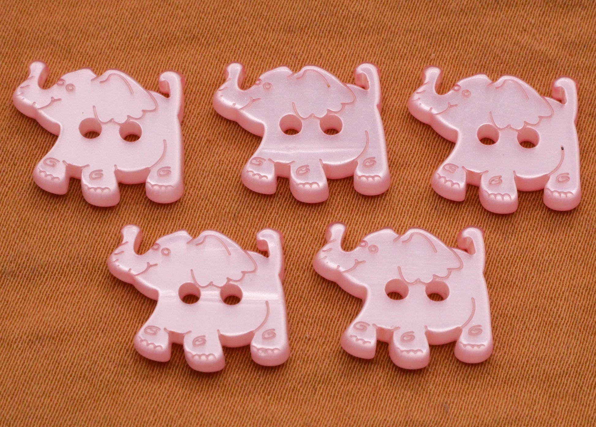Adorable pearlized look pale pink elephant sew-thru buttons! Sold in sets of five. Each plastic button measures 12 x 15mm / .47" x .59".