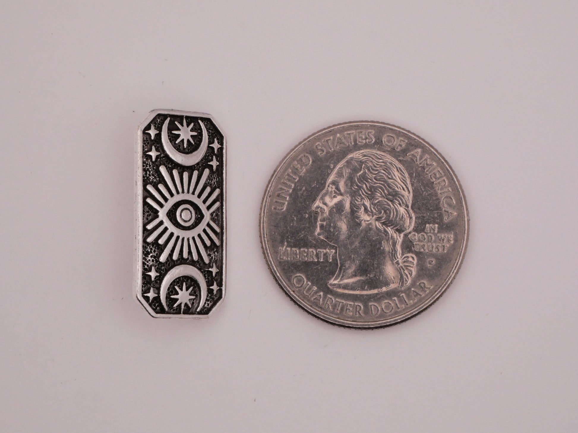 Fantastic eye sun, crescent moons, and stars on this long antiqued silver color metal button. Measures 12 x 23mm / .47" x .91".