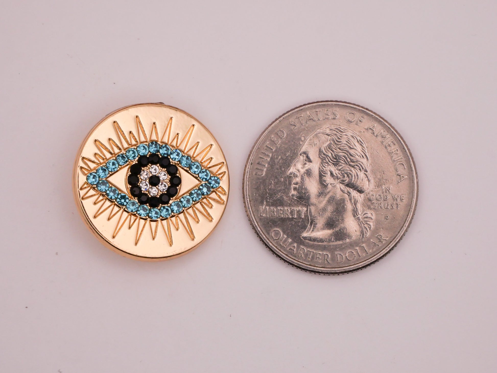 Stunning shiny gold metal button with rhinestone eye design. Measures 22mm / .87" in diameter.